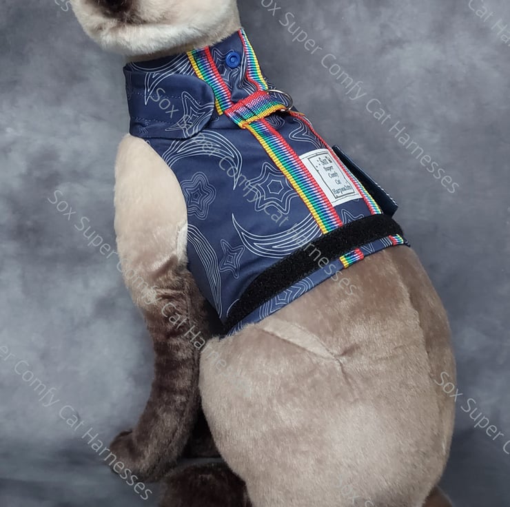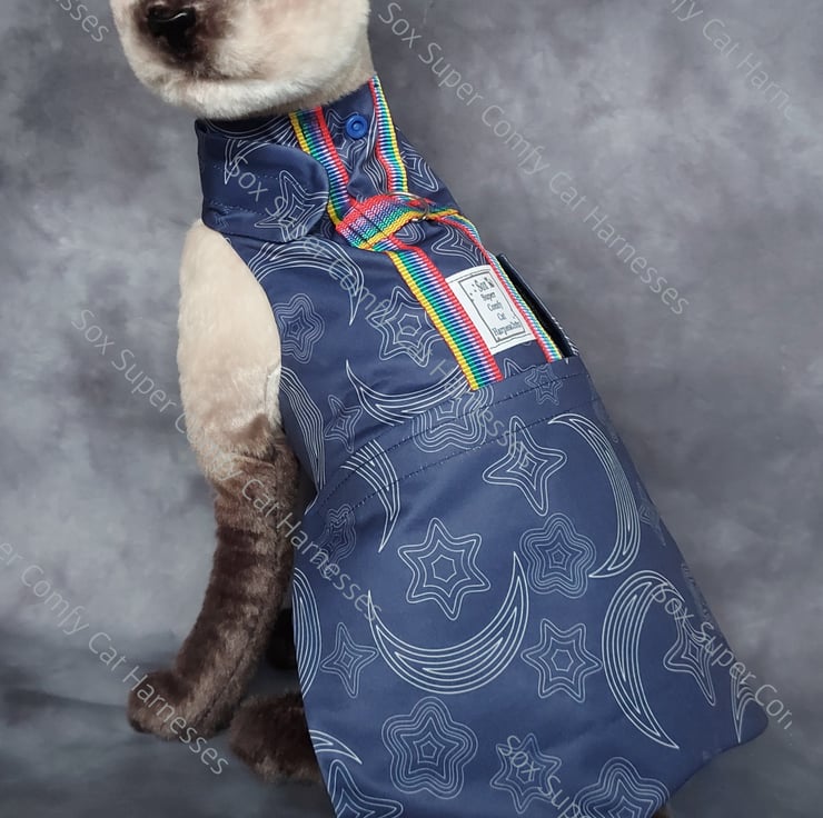 Introducing my innovative, All Season cat harness! Designed for the comfort and safety of your feline friend in any weather. Made in this lovely blue with a moon and stars pattern! Easy to put on and remove with hook and loop fasten on the neck and abdomen. A harness and jacket all in one!