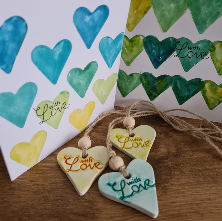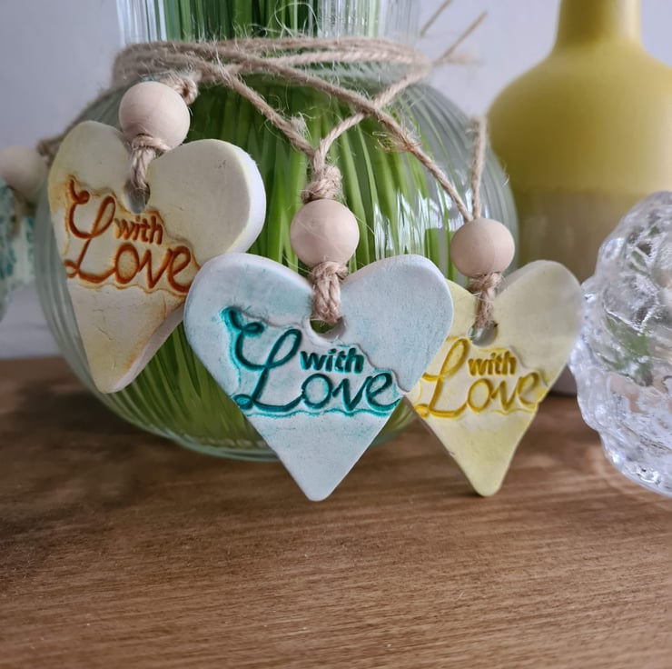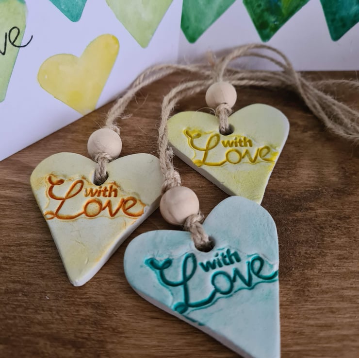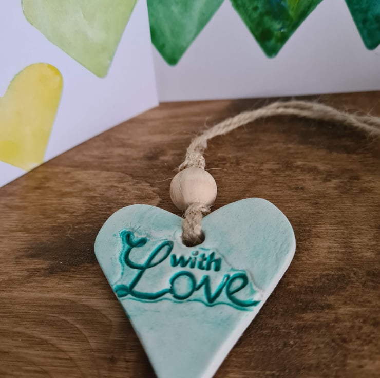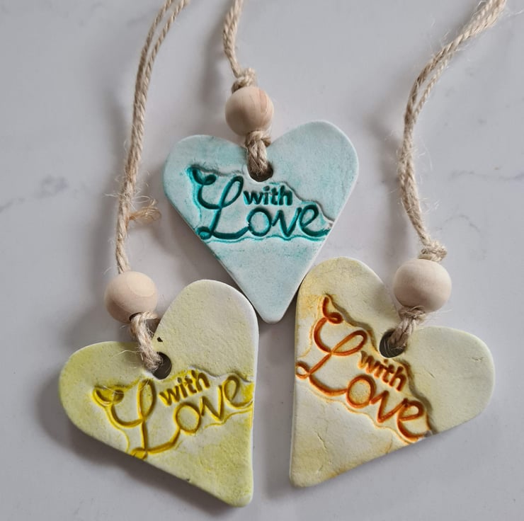 This pretty heart shaped hanging decoration is made from air-drying clay, embossed with the words 'with love' and given a colour wash to highlight the wording. Once dry, I gave it a layer of matte varnish to protect it and added twine and a bead to finish. The listing is for one decoration, which is available in a choice of three colours. This would make a lovely gift tag for an anniversary or valentines gift, or a gift in itself - or keep for yourself! There are matching cards available in my anniversary collection.