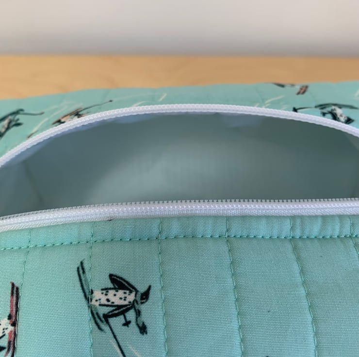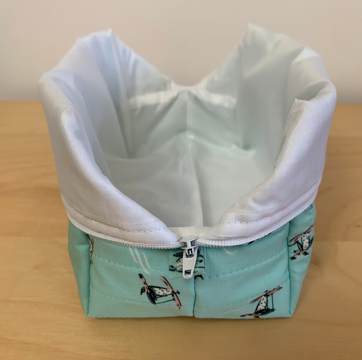 The box shape makeup bag was created as an alternative to straight sided bags that I had previously made. It took a while to perfect the method of the fully enclosed lining, but it was worth it to achieve such a lovely neat finish.