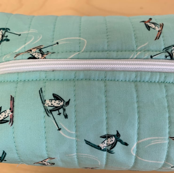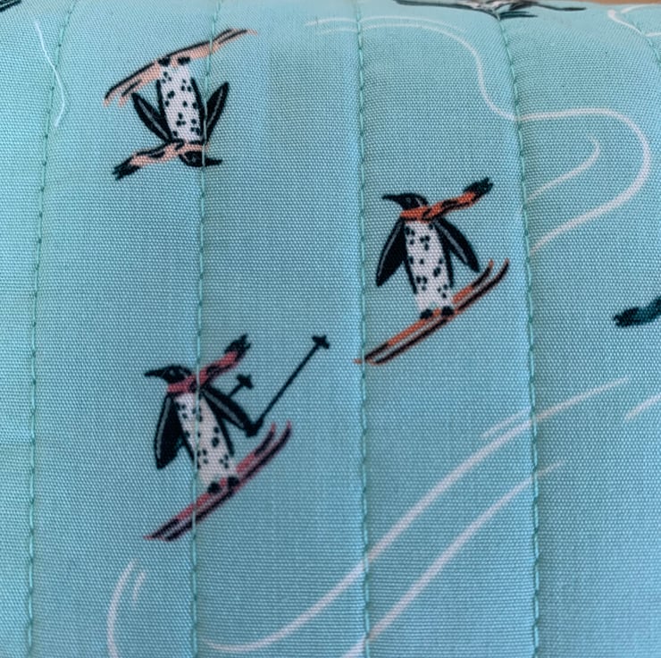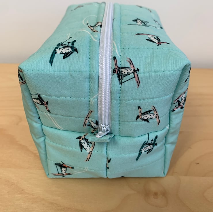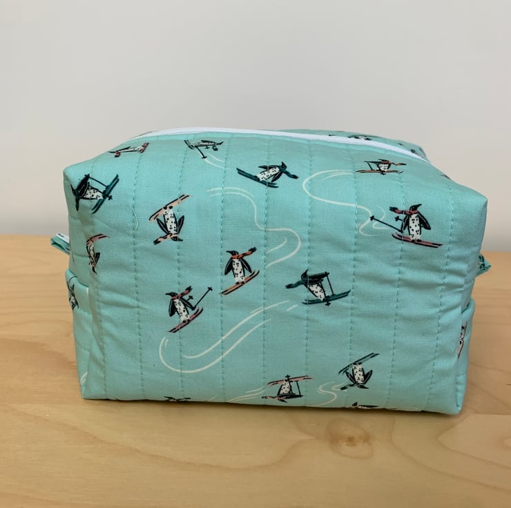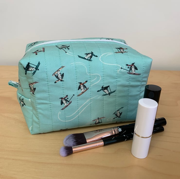 The Box Shape Makeup Bag is made in this fun Penguins on ski’s cotton print.