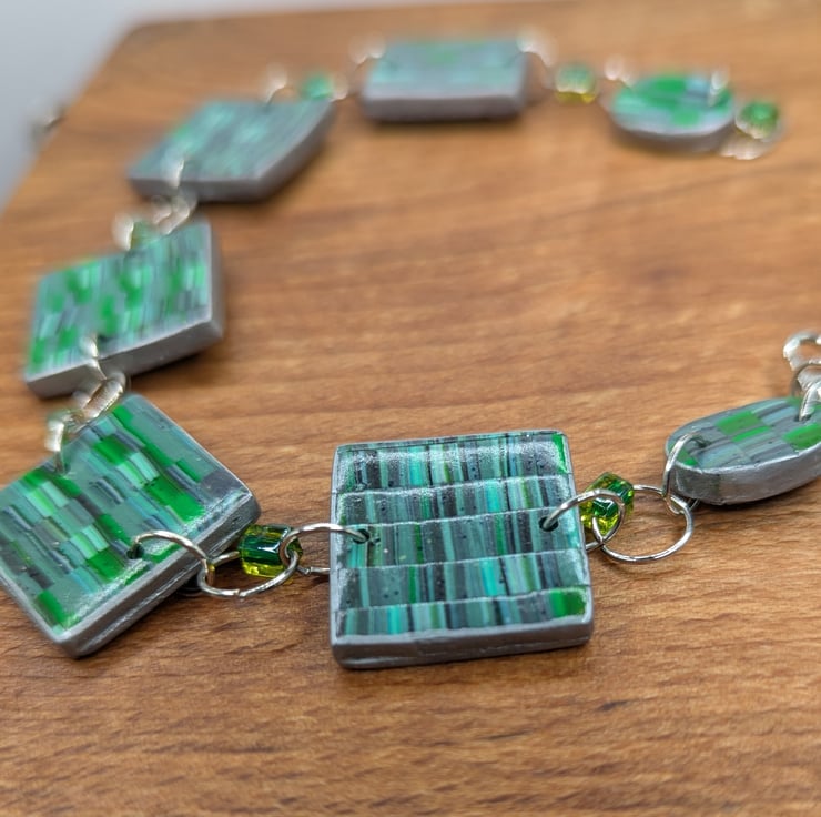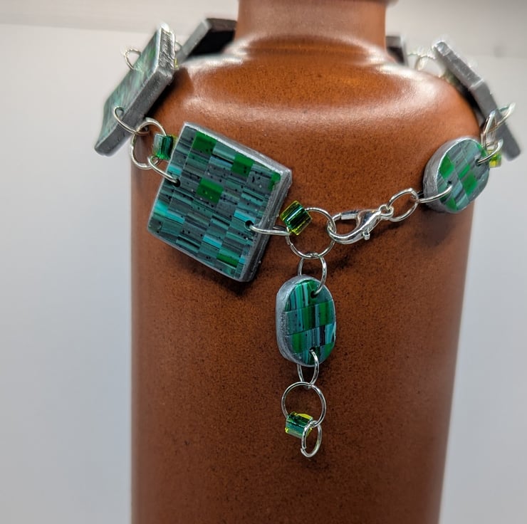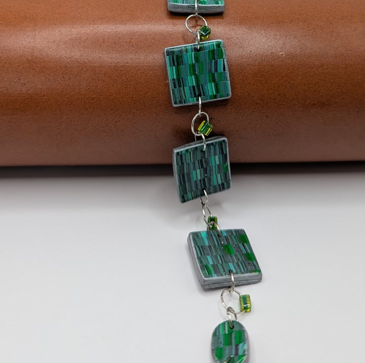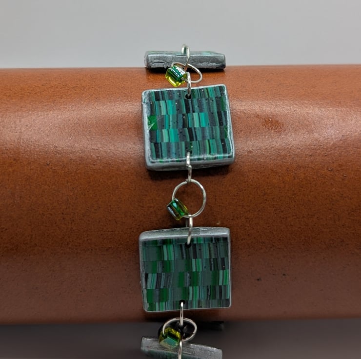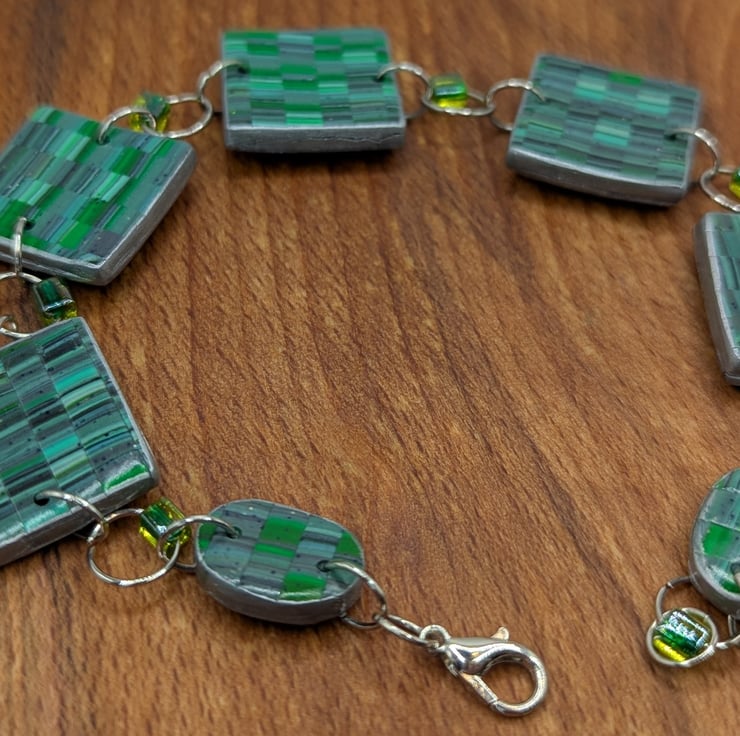 This beautiful bracelet is handmade from polymer clay, giving the appearance of little mosaic tiles, providing a pixelated effect or a natural malachite stone.