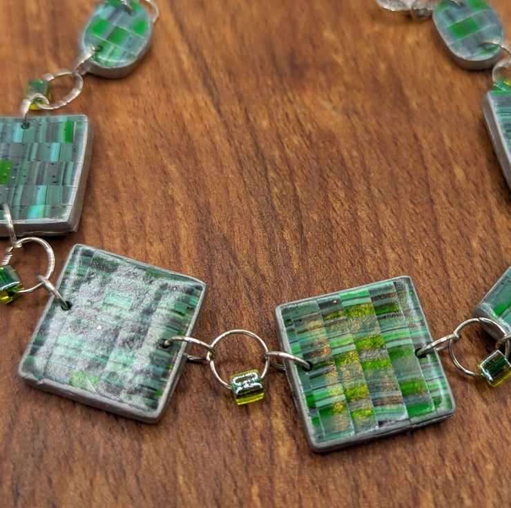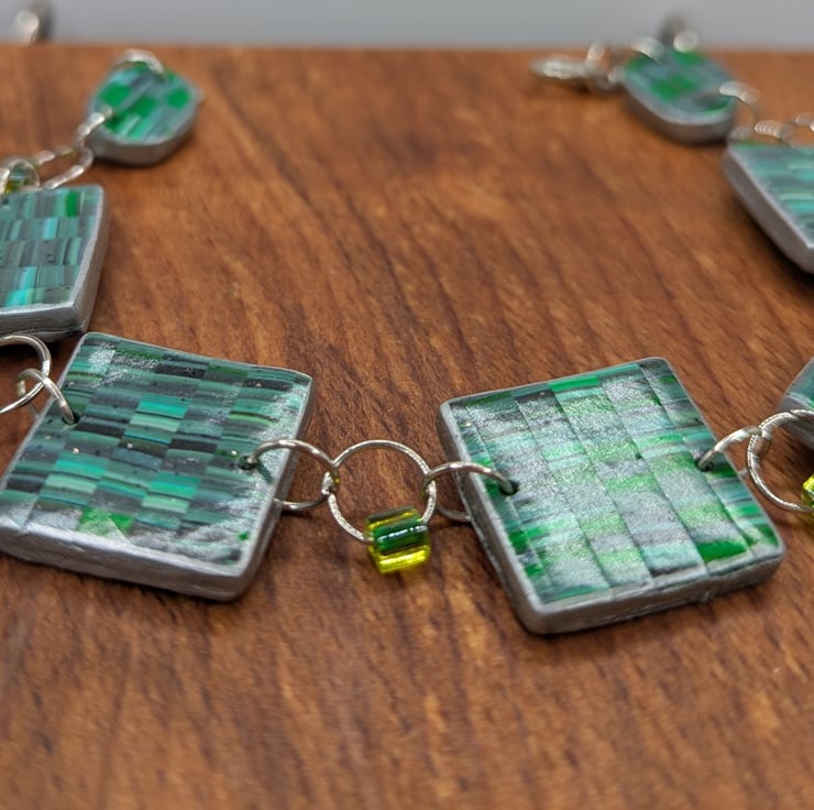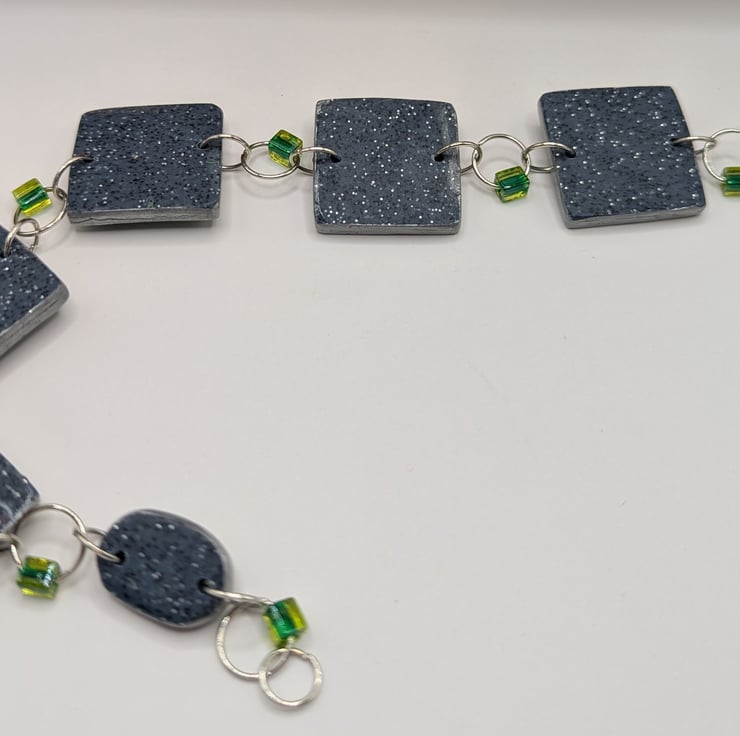Each tile is shades of green and grey with a little sparkle added, to the rear of each tile is a sparkle grey stone effect. A small oval tile is at either end of the bracelet. Each tile is linked by jump rings and small green glass beads interrupt the links giving a more sophisticated style.