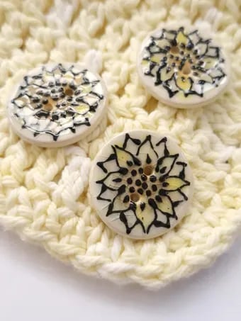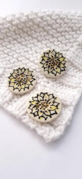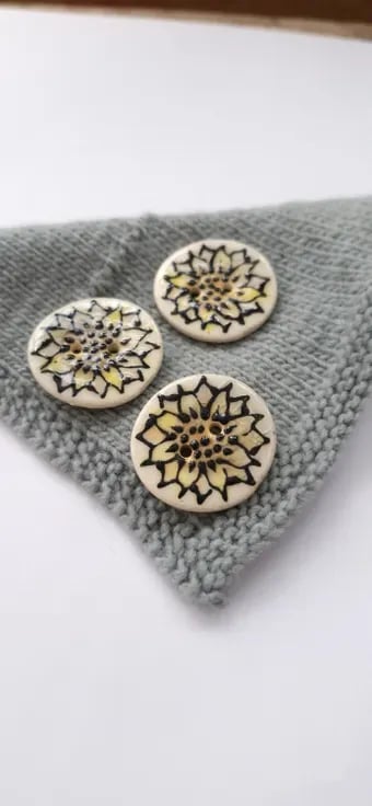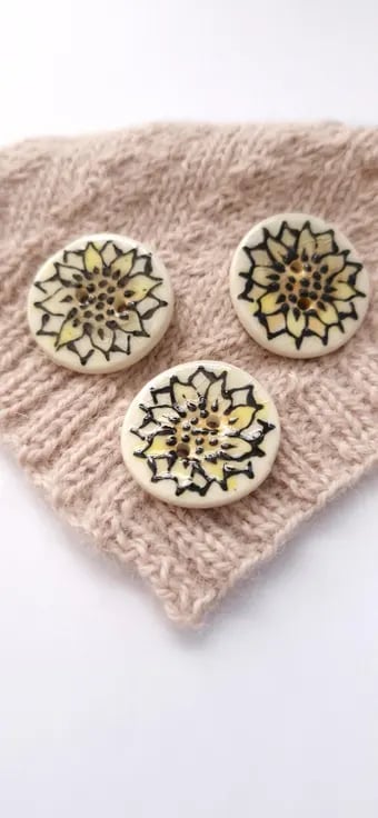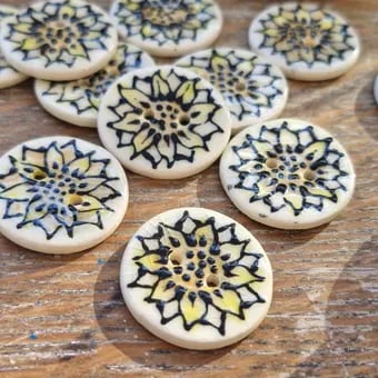 These sunflower buttons are individually handprinted. I layer up the colour of the petals prior to adding the raised black slip, which I pipe on. The raised slip leaves a wonderful raised design adding to the texture of the buttons.