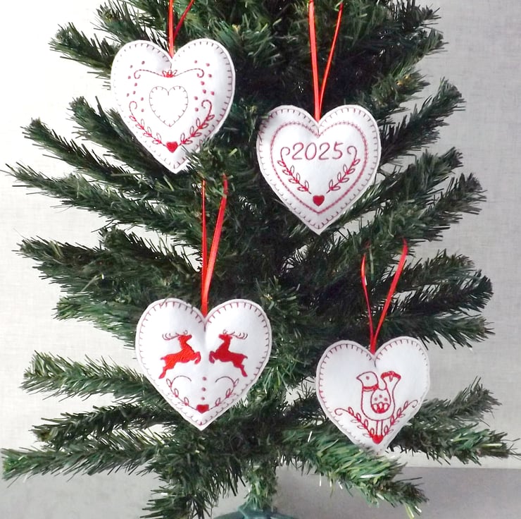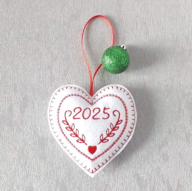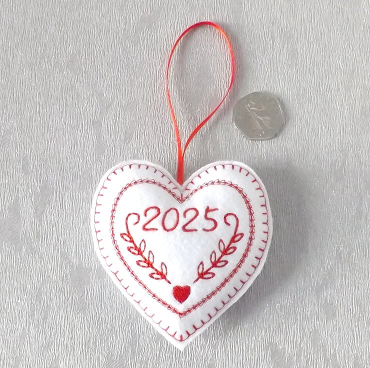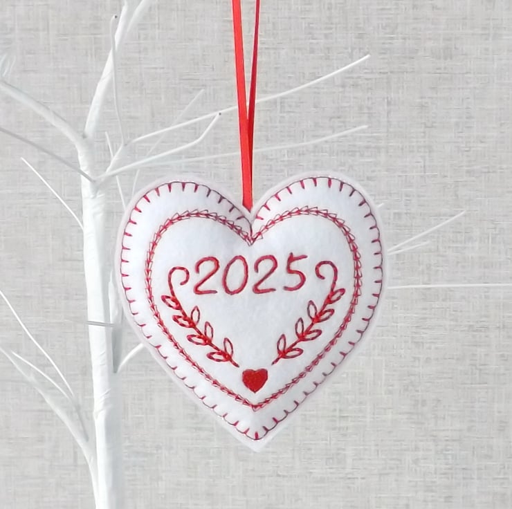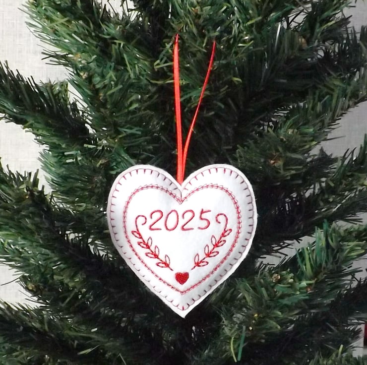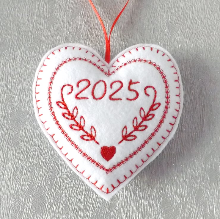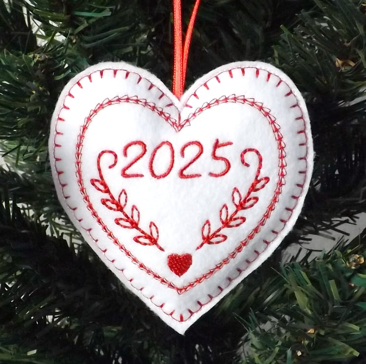 Embroidered on the front with a floral and heart design with 2025 in the centre, using rayon embroidery threads in red, and stuffed with polyester stuffing.