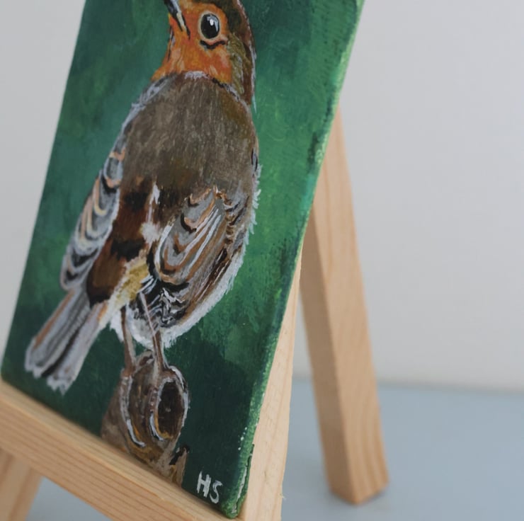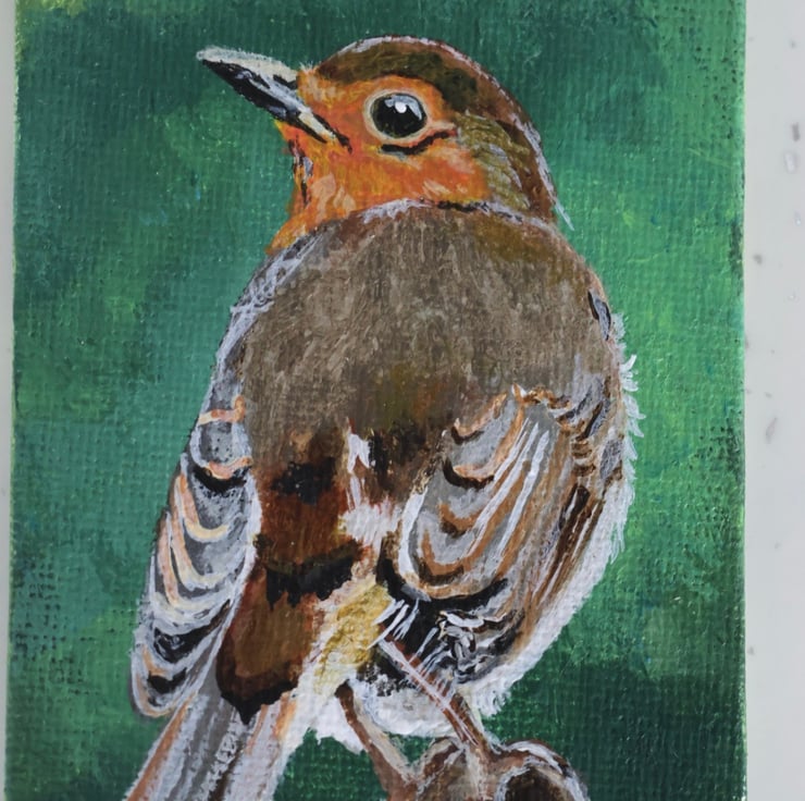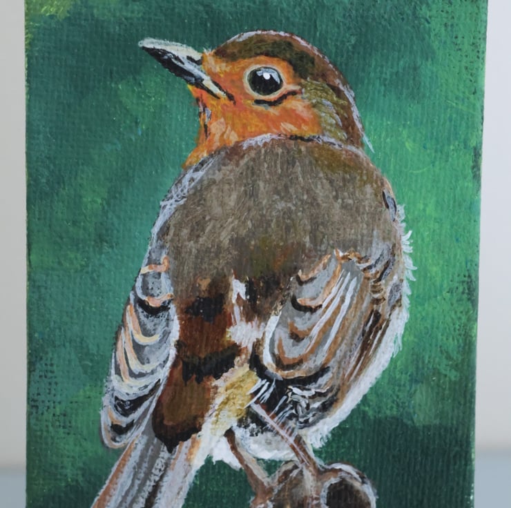 I’ve painted this cute robin on a 3.5 inch by 2.5 inch canvas board.