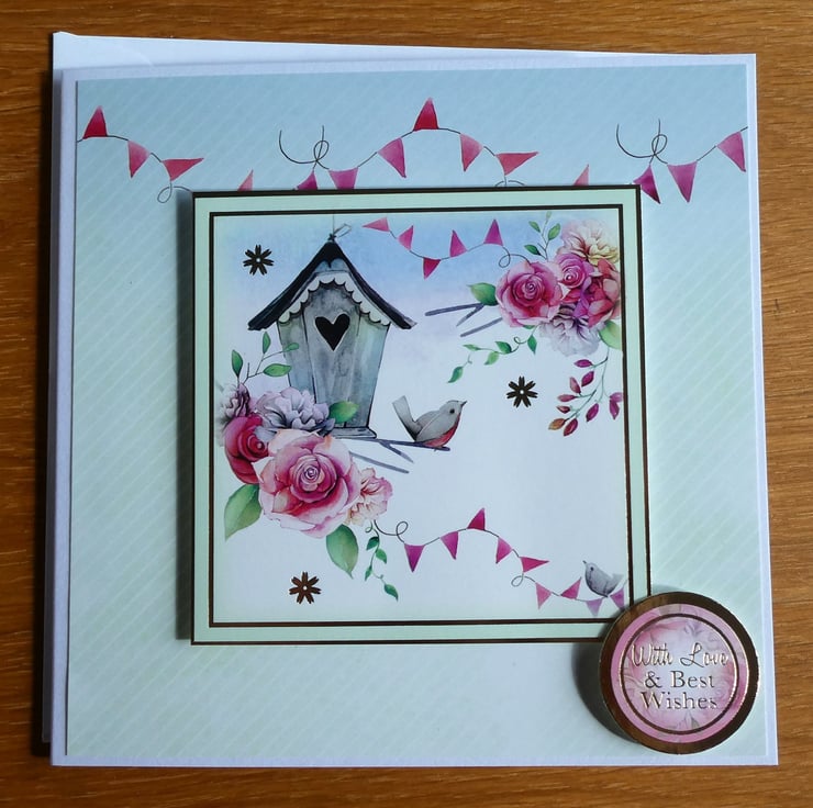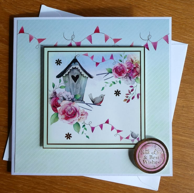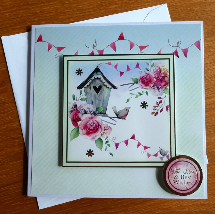 This card in shades of pink, blue and green has an image of a bird sitting next to a bird housse, surrounded by flowers. With the message With Love & Best Wishes it could be sent for many different occasions, such as birthday, new home or get well.