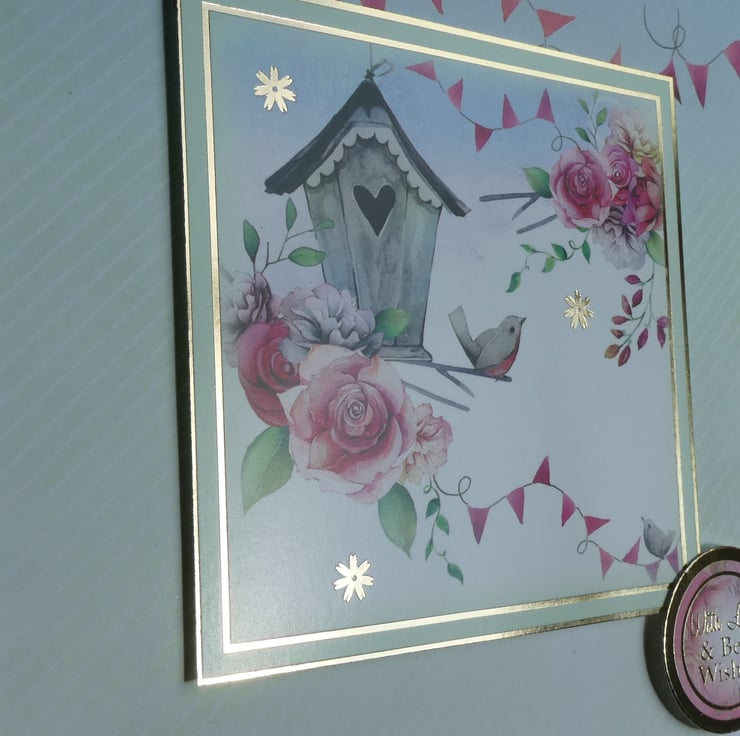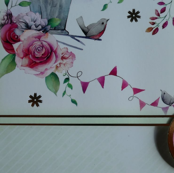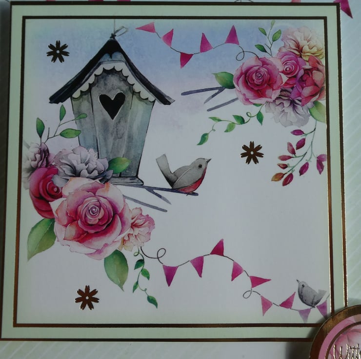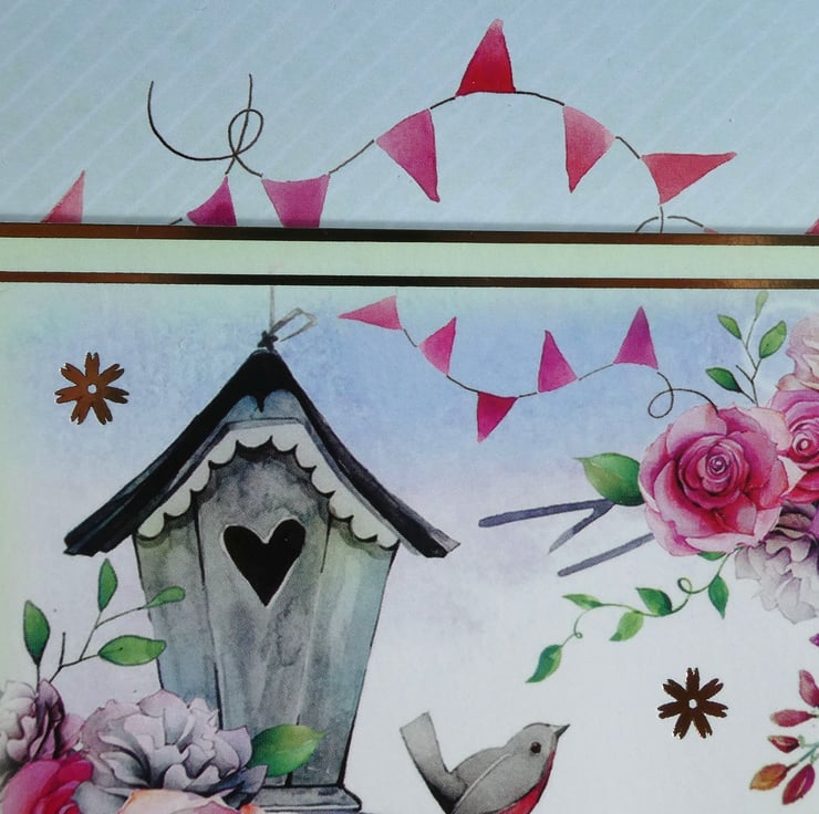A printed background of pale green and white diagonal stripes has a row of rose pink bunting across the top. The card has a central printed topper with the image of a bird sitting on a branch, next to a grey bird house, surrounded by pink roses.