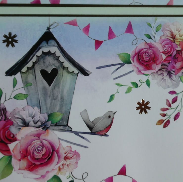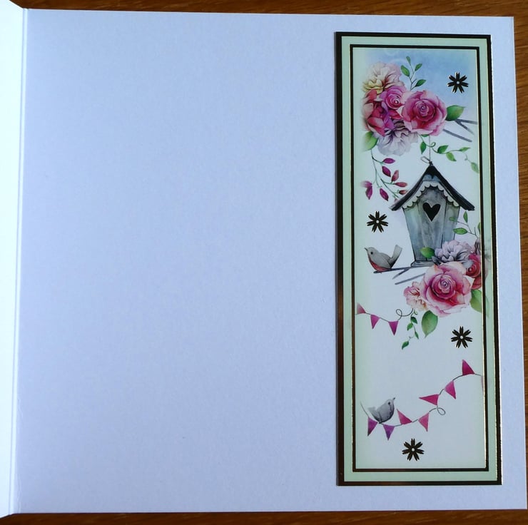Inside the card is a rectangular image of the same bird, bird house and roses down the right hand edge.