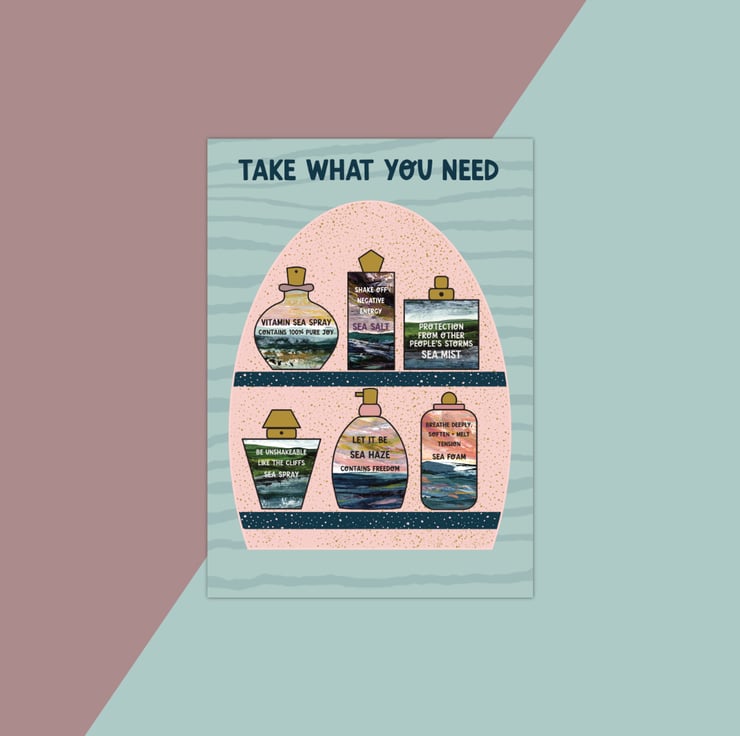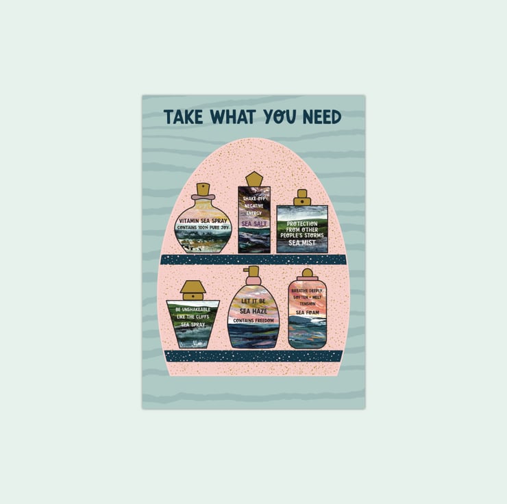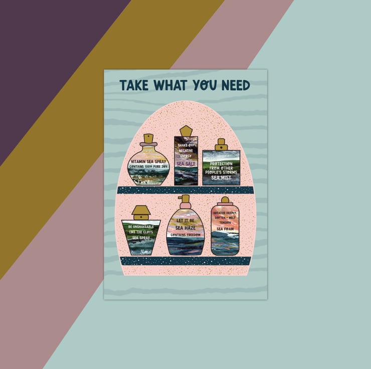 ‘Take What You Need 1’ art print – inspired by a thought I had of how amazing it would be to bottle all the wonderful feelings and the wisdom gained by being by the sea. I hope this collection brings a little reminder to tap into the magic of the sea and helps you to find peace, freedom and protection each day. I designed these prints as if it’s a magical cupboard full of glimmering bottles and you can choose what you need each day.