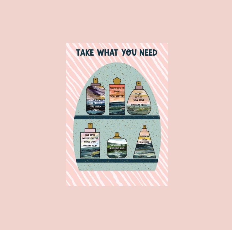 ‘Take What You Need 2’ art print – inspired by a thought I had of how amazing it would be to bottle all the wonderful feelings and the wisdom gained by being by the sea. I hope this collection brings a little reminder to tap into the magic of the sea and helps you to find peace, freedom and protection each day. I designed these prints as if it’s a magical cupboard full of glimmering bottles and you can choose what you need each day.
