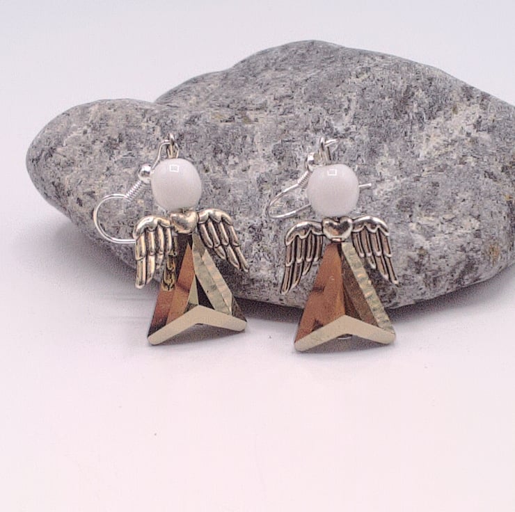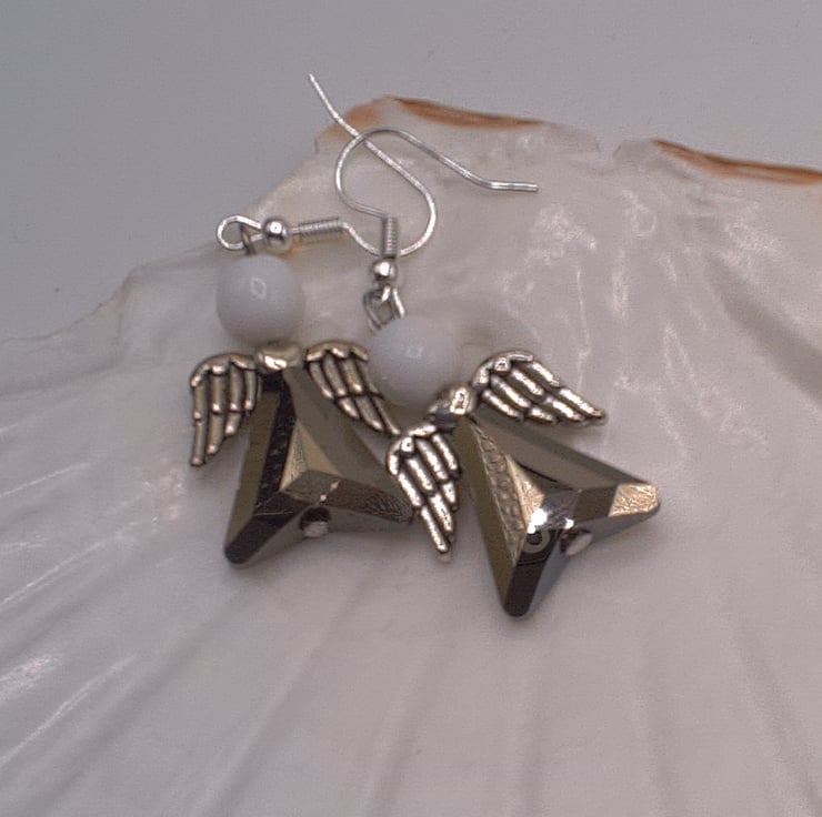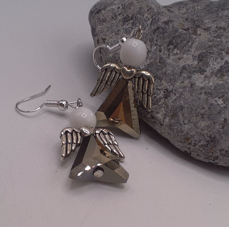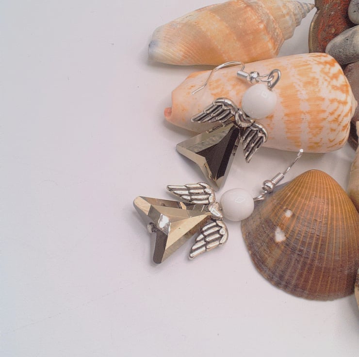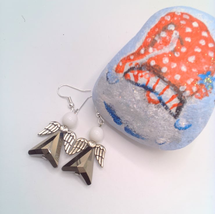 Silvery Grey Crystal & White Glass Bead Christmas Angel Earrings, Secret Santa , Christmas Gift, Earrings, Gift for Her, Angel Earrings, Birthday Gift, Anniversary Gift