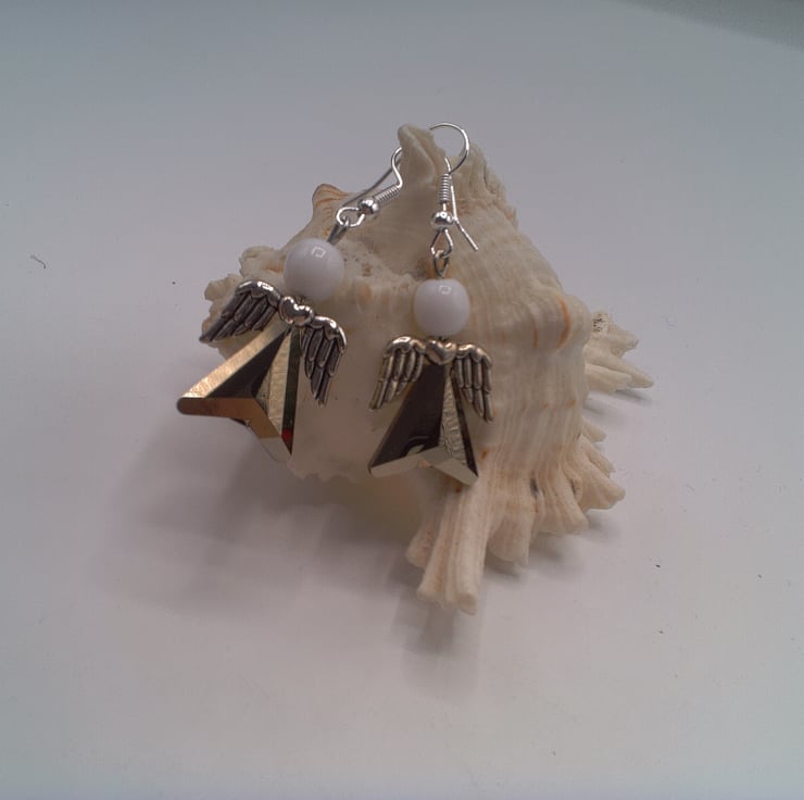 These stunning crystal Angel earrings would look great with any outfit you wear for day wear or for a casual party at Christmas time. They would make a lovely gift for a friend or relative for a birthday o, Christmas a Secret Santa gift for a stocking filler, or a treat for yourself. They are made using 10 x 10 mm silver crystal arrow head shaped bead, an 8 mm round white opaque glass bead and silver plated angel wings. They are on silver plated lever backs and they have a drop of 3.5 cm. The earrings will be dispatched wrapped in tissue paper in an organza bag and delivered to you via Royal Mail 1st class post.