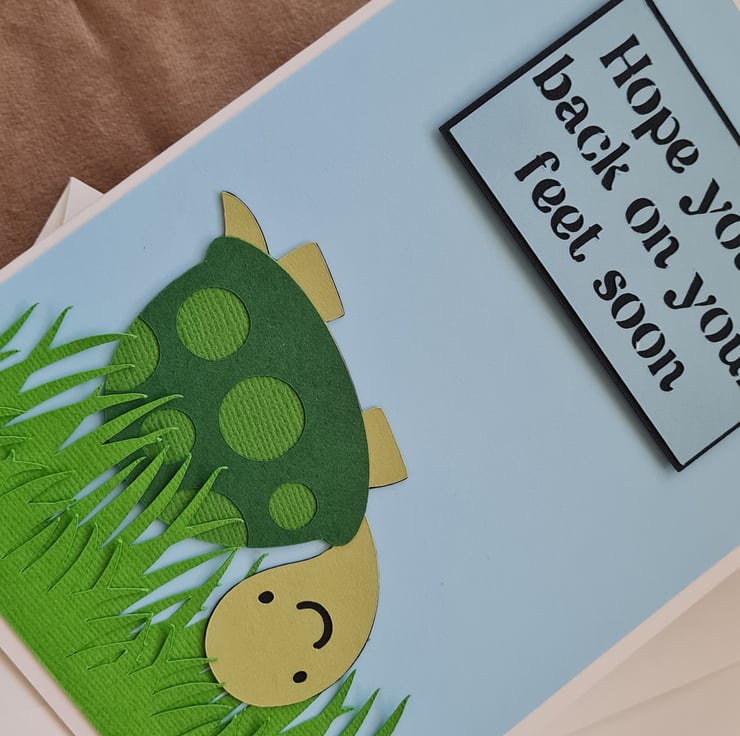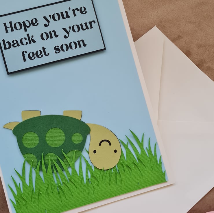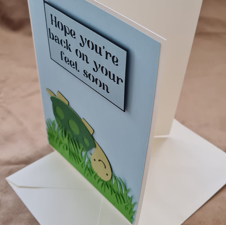 When someone’s feeling a little tucked away, this cheerful turtle card is the perfect way to coax out a smile. With its gentle message—“Hope you're back on your feet soon”—and a friendly face peeking through the grass, it’s a sweet reminder that recovery doesn’t have to be rushed.