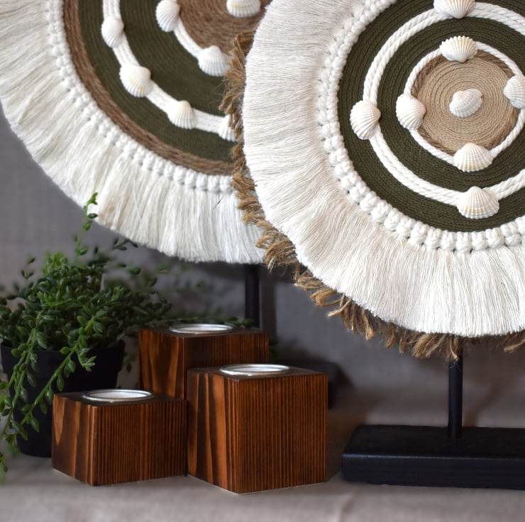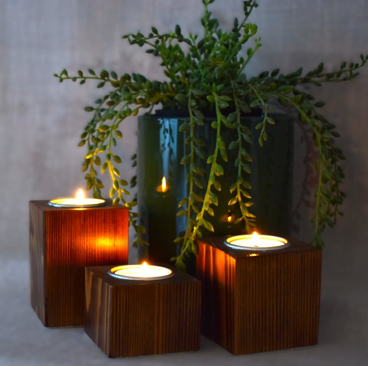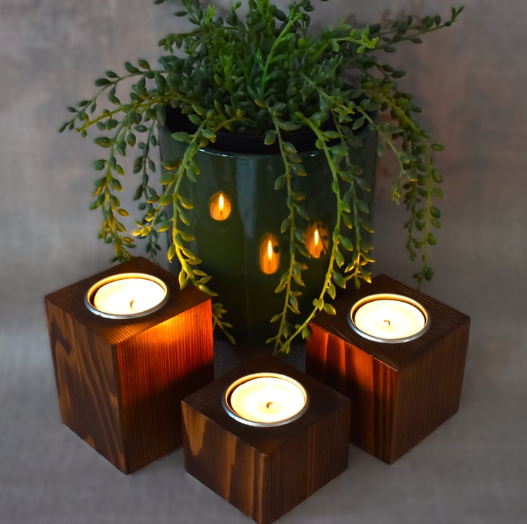 A handcrafted set of three tealight holders made from upcycled pallet blocks. Designed in staggered heights, they create a beautiful tiered display—perfect for adding warmth and atmosphere to a mantel, dining table, or cozy corner.