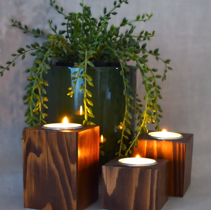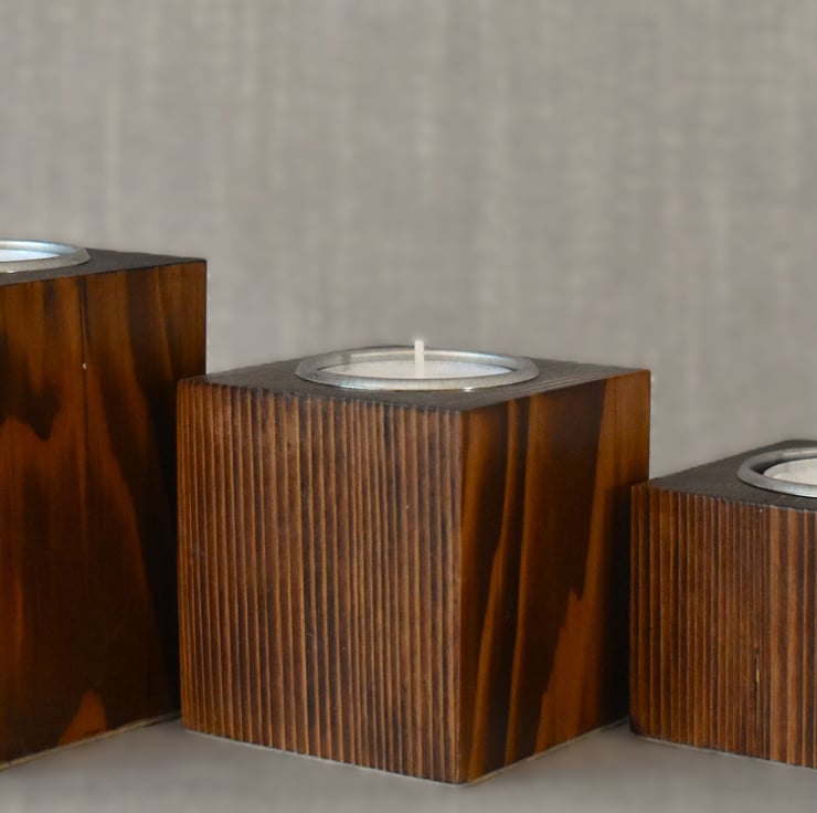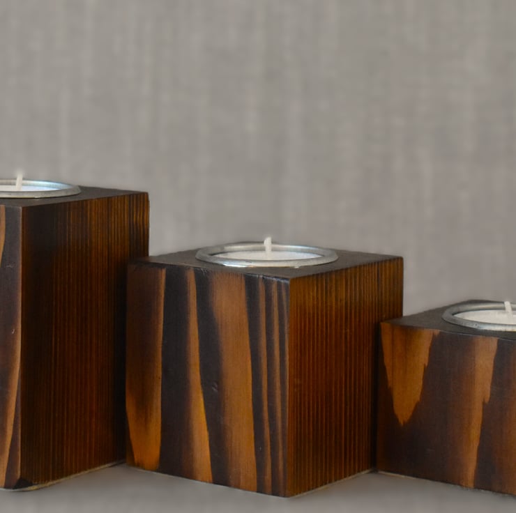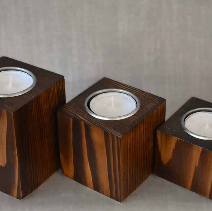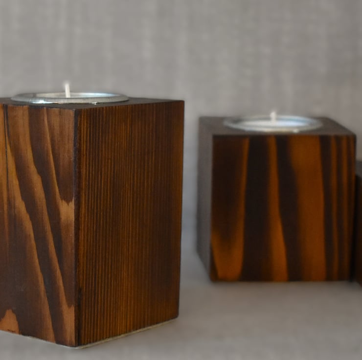 Each block is made from solid pine, carefully sanded to a smooth finish, and stained in a rich dark oak before being sealed with a matching wax. This process highlights the natural grain of the wood while giving the holders a timeless, rustic look.