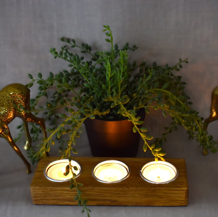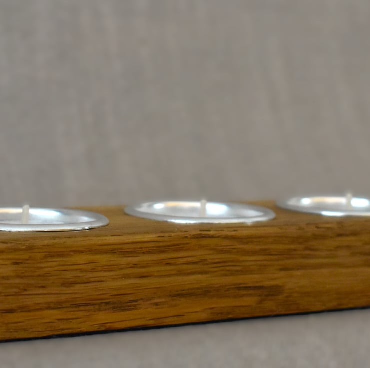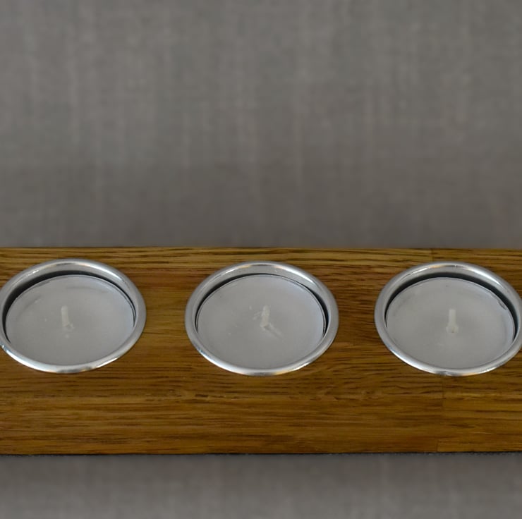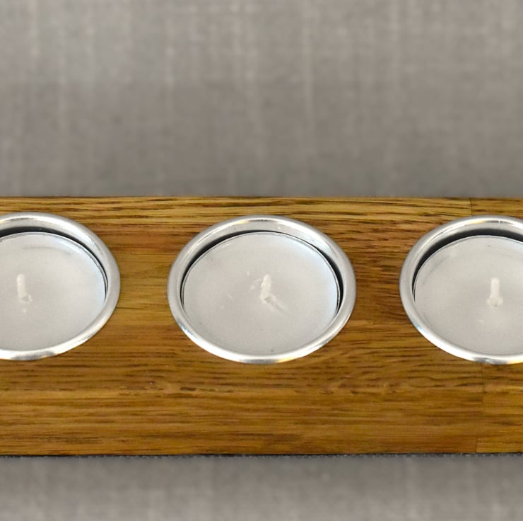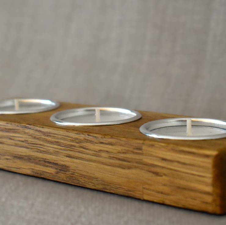 A handcrafted low block tealight holder made from reclaimed solid oak salvaged from a discarded table. This piece features three centered tealight slots, carefully sanded and finished to highlight the warm tones and natural grain of the oak.