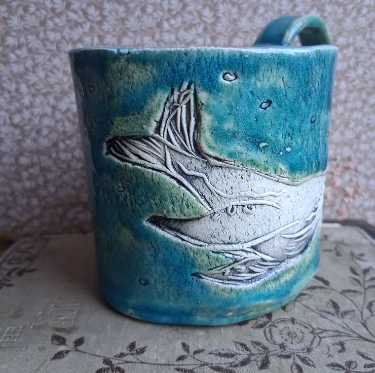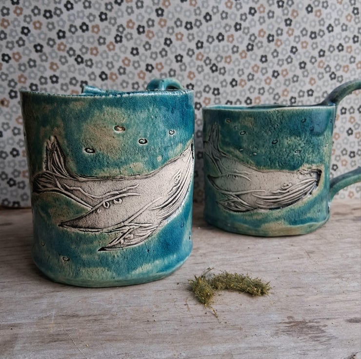 Whale coffee mug, in soft watery blue colours varies each time, stoneware clay, handbuilt and shaped, whale design made with my hand carved linocut