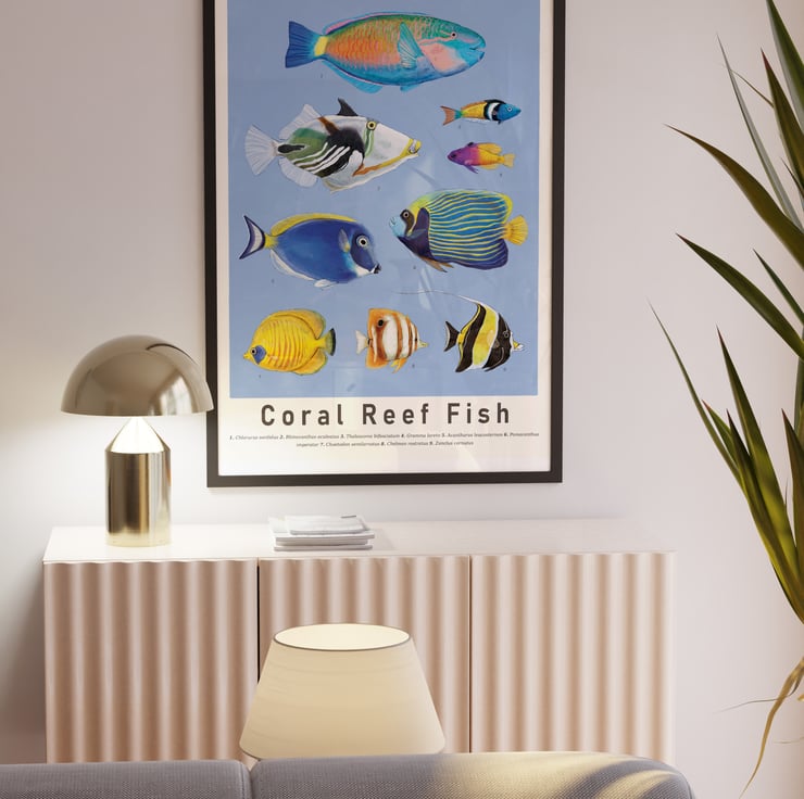 Scientific illustrated art print featuring detailed drawings of the amazing rainbow coloured tropical fish. Latin names of the species at the bottom of the print.