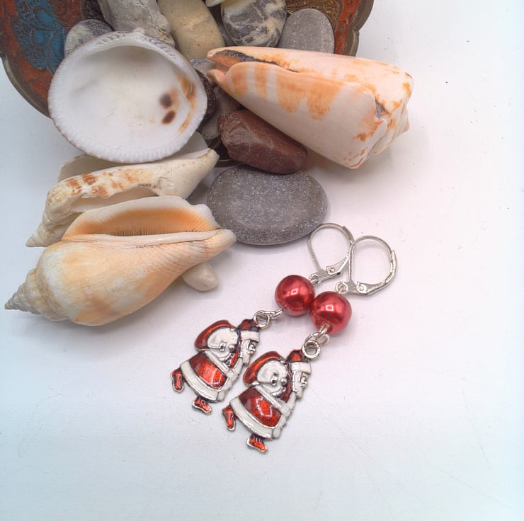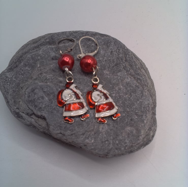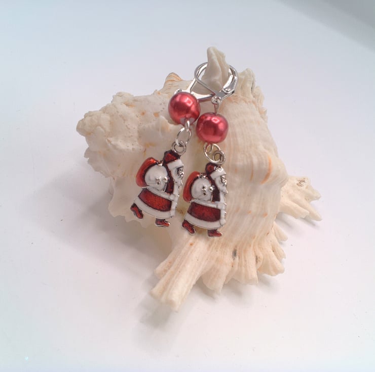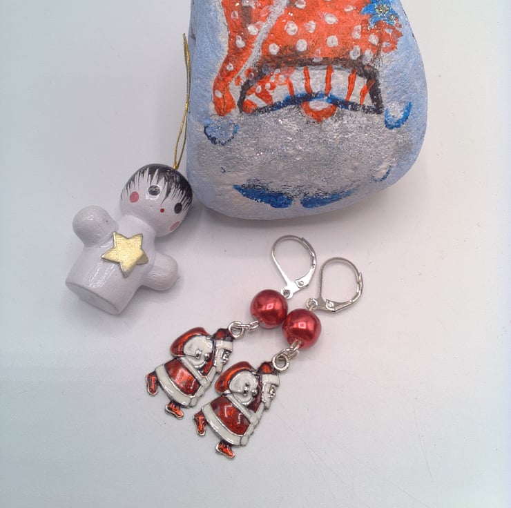 These pretty Christmas earrings would look great with any outfit you wear at Christmas time during the day or for a casual evening party. They would make a lovely gift for a friend or relative, for a birthday, or Christmas, a great Secret Santa Gift or stocking filler or a treat for yourself. The earrings are made using a red glass pearl bead and an enamelled Santa charm on silver plated lever backs. They have a drop of 4 cm (1.5 inches) from the base of the ear lever back. The earrings will be dispatched wrapped in tissue paper in an organza bag and delivered to you via Royal Mail first class post.