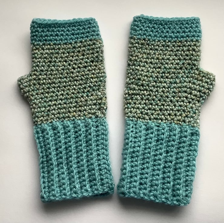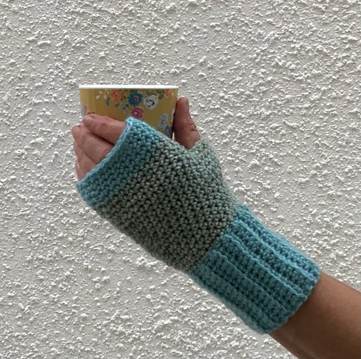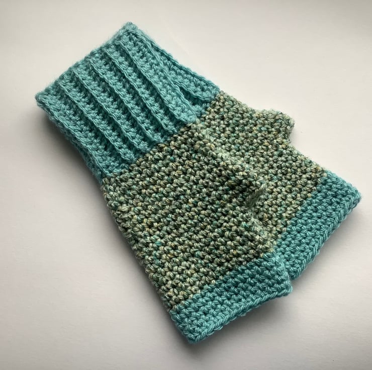 COLOUR: ' Stream'' - the wrist and fingertip sections are a lovely aqua blue / light turquoise .The main section is a mottled mix light blues and light green.