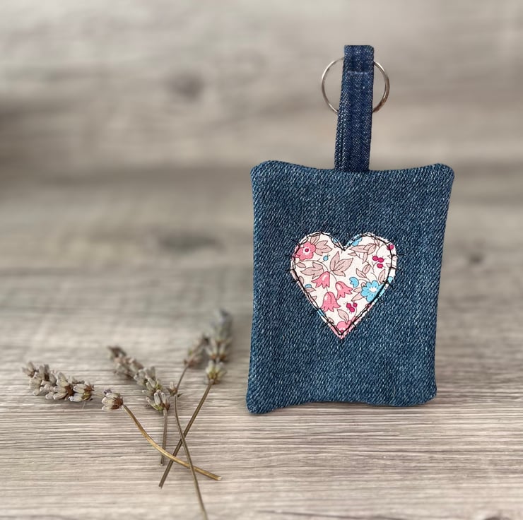 The keyring is made of repurposed denim and features a floral Liberty of London heart with a white background.