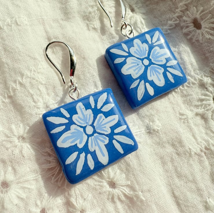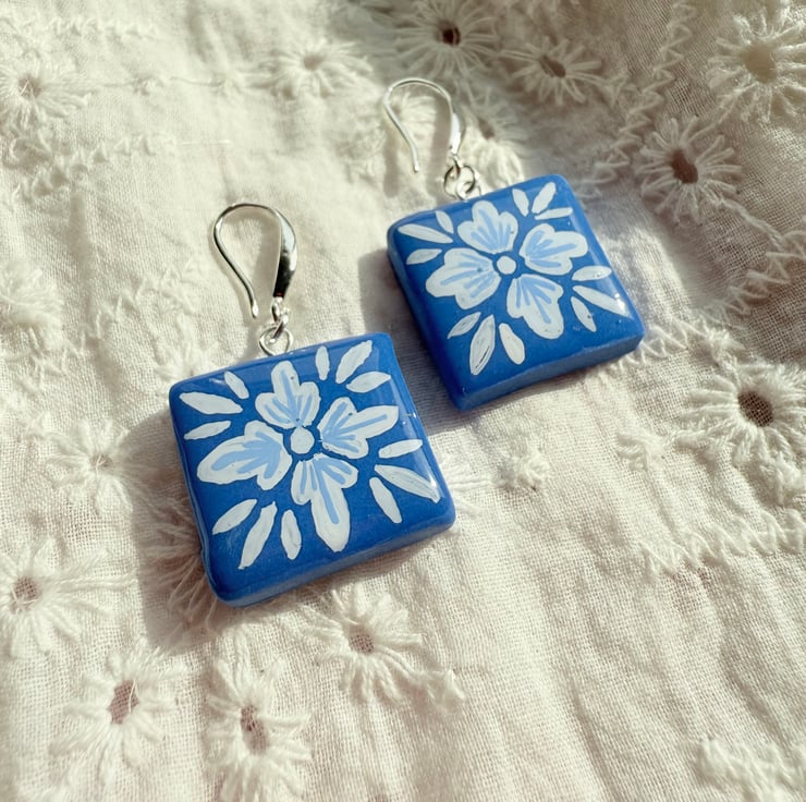 Like miniature azulejo tiles plucked from a sunlit wall, these earrings carry the timeless beauty of Portugal’s hand-painted artistry. Each square is made from Cornflower Blue Polymer clay and adorned with a White folk-style floral, evoking the breezy courtyards and tiled streets of the Algarve.
