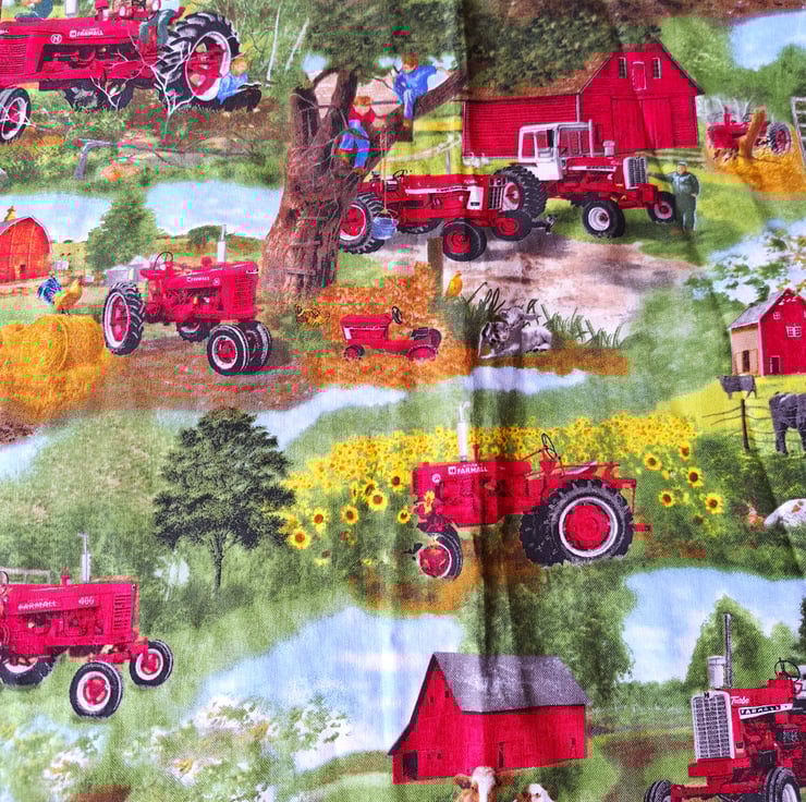 This lovely colourful apron has American farm scenes, depicting red tractors and children playing among the trees. The tractors may not appear in the same positions as in the photo. It is 100% good quality cotton, with generous acrylic herringbone straps and can be machine washed. It is 27.5" (70 cm.) from neck to hem and 18" (46 cm.) at the widest point and will fit a child from about ten to a small adult. A great gift for a young man who enjoys cooking!