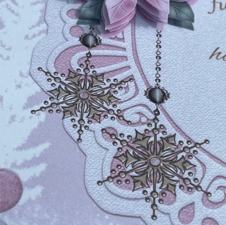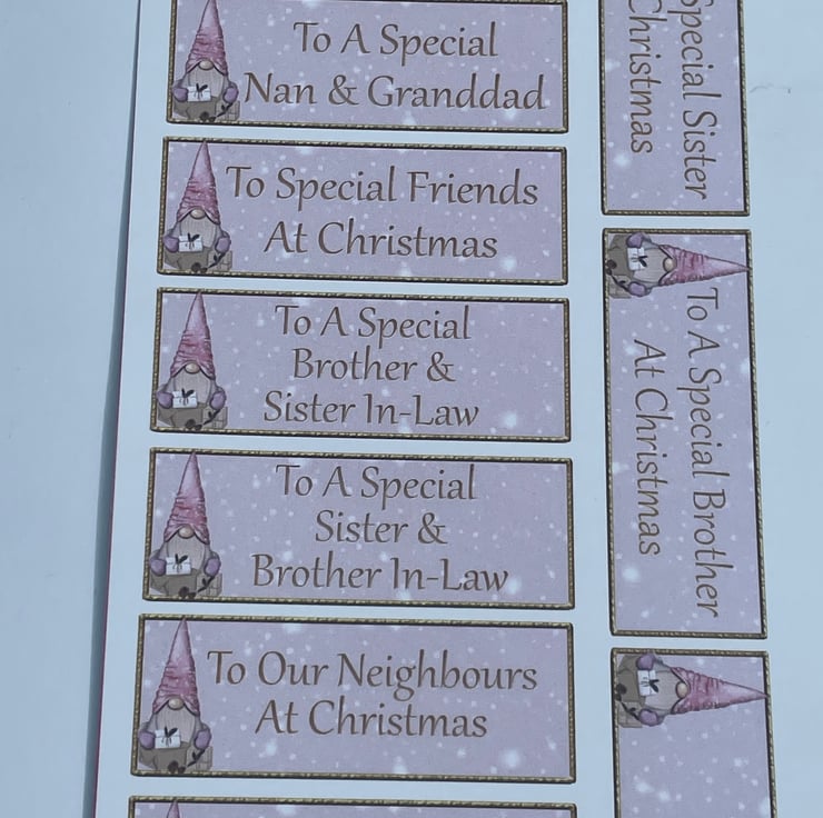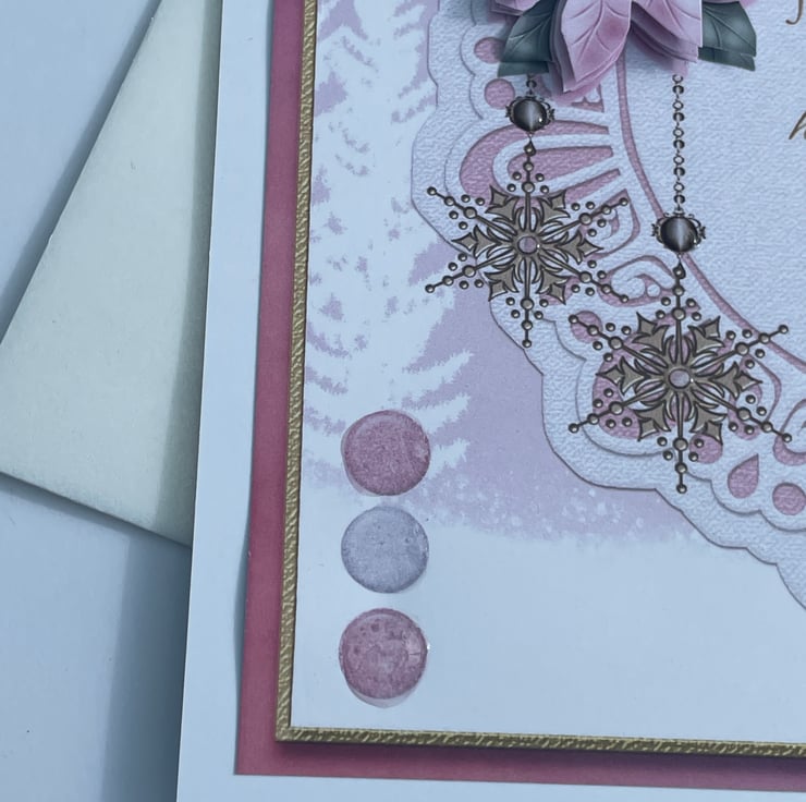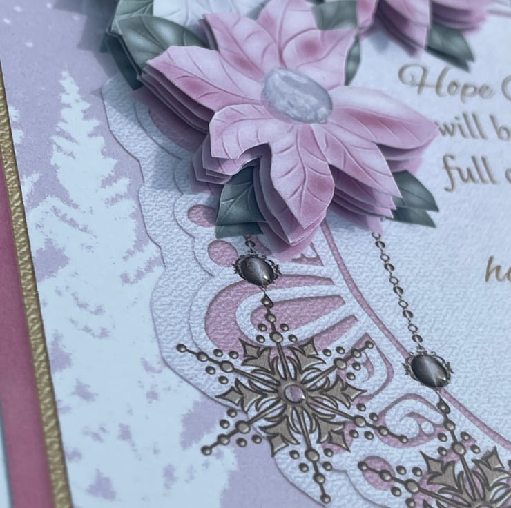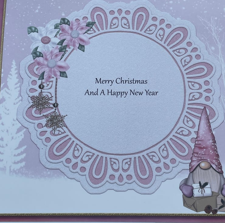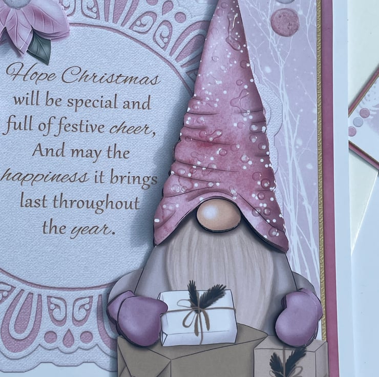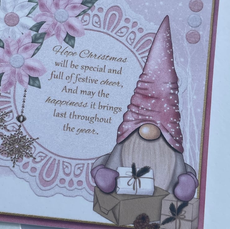 Send some festive cheer for Christmas in a beautiful pink. This 18x18cm card features a gnome in a pink hat and mittens. The card is also a matching pink with a lace style wreath around the lovely Christmas verse. This reads Hope Christmas will be special and full of festive cheer, and may the happiness it brings last throughout the year. The design is finished with pink poinsettias and snowflakes. Inside the card has a matching insert that says Merry Christmas and a happy new year. The card can be customised with the matching greetings in the last picture, or I can add your own. The design comes with a matching tag.