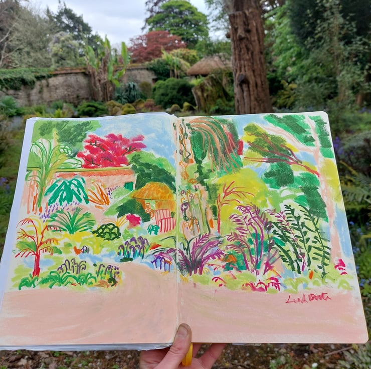 A pastel study of the Rockery at Enys Gardens. I love capturing the bold shapes of the plants and trees.