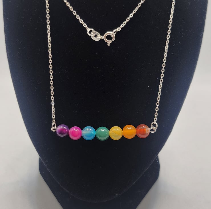 Sterling Silver chain with additonal feature of 7 agate round beads designed in a rainbow style in a pendant.
