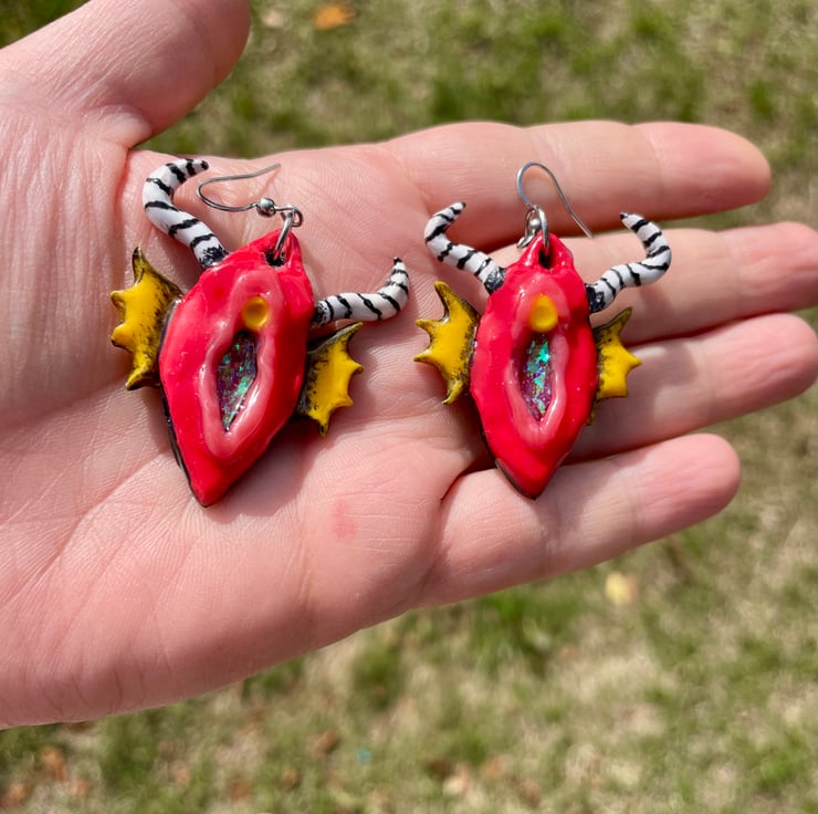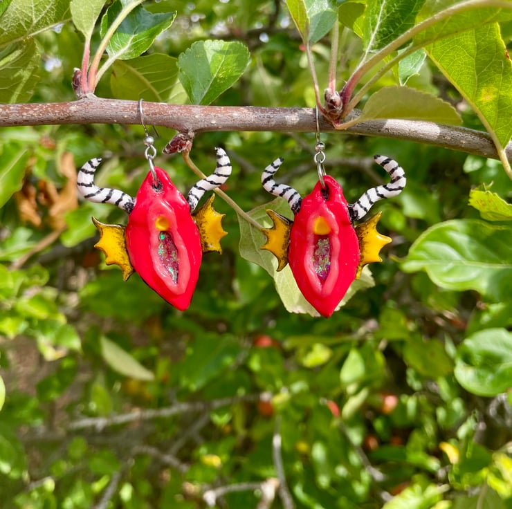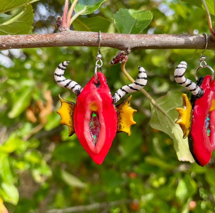 These earrings were such a joy to create – my take on the Hellfire Club from Stranger Things. I wanted to capture their playful devilish energy while still celebrating the sacred yoni form.