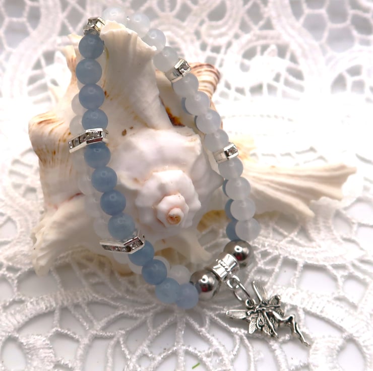 I enjoyed making this Beautiful Bracelet. 2 Rows of 6mm semi-precious Gemstone Beads. Blue Jade and Selenite. I have added these gorgeous Silver Rhinestone Spacer Beads that join the rows together. The 8mm Centre Beads are Stainless Steel and the Fairy Charm is Silver Plated. The Bracelet will fit a 6 1/2 - 7inch wrist.