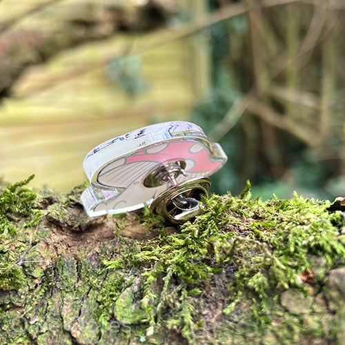 This little mushroom might not pop up after the rain, but it’s ready to brighten your day. Made from recycled acrylic, it’s an eco-friendly and sustainable badge with a big dose of whimsy.