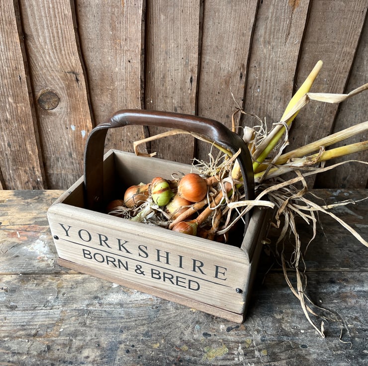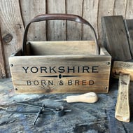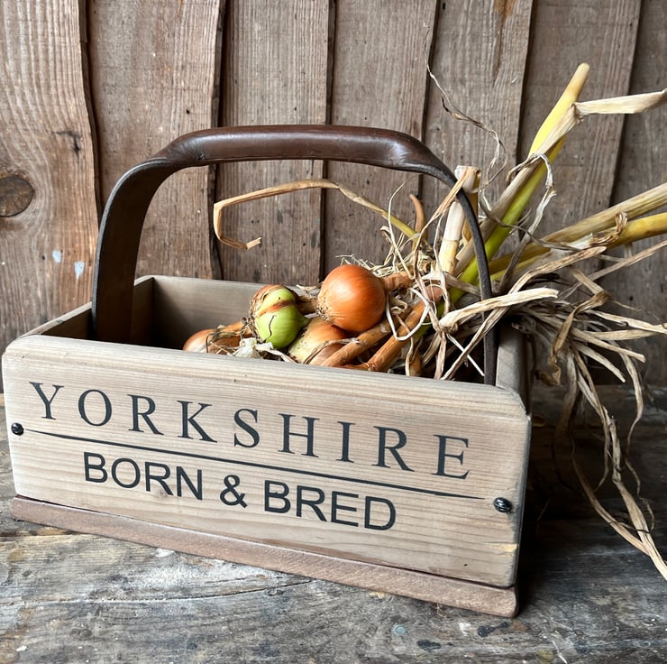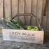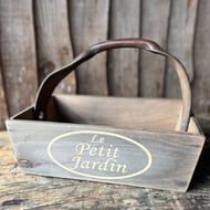 Smaller than usual trug with a BIG message. Made from up cycled pine shelving ,aged and battered. The base is cut from an old kitchen cupboard door. The reverse carries traditional gardeners request .