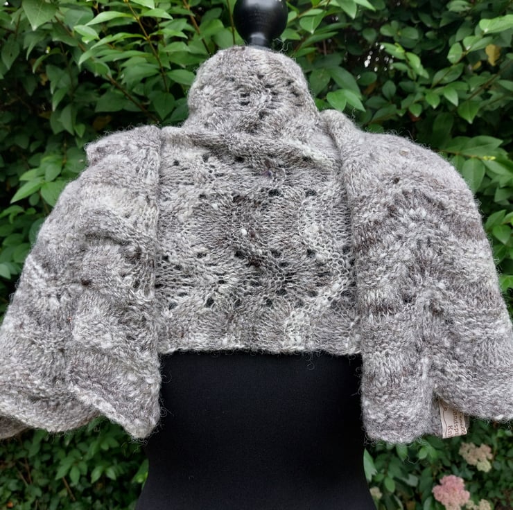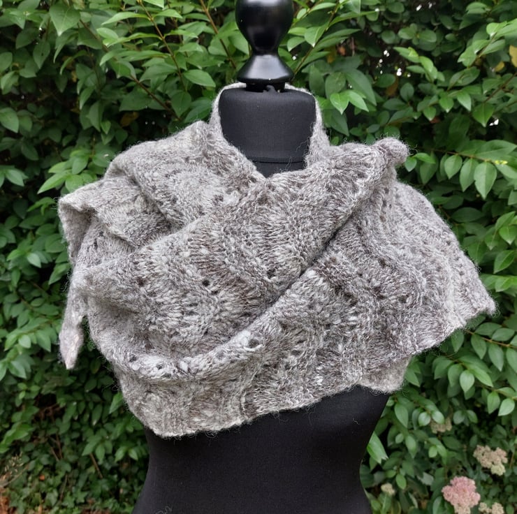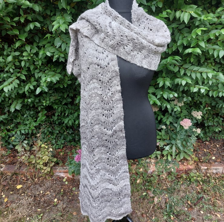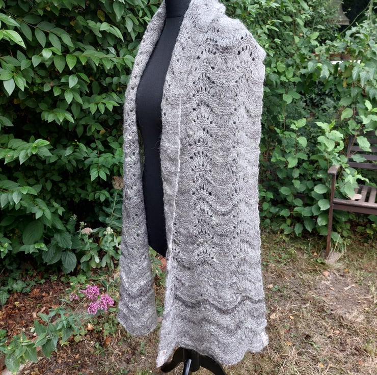 This warm, luxurious stole is hand-knitted in a variation of ‘Old Shale’, an old Shetland lace pattern, which creates the scalloped edging.