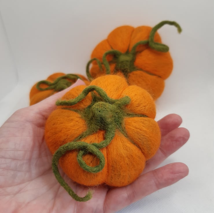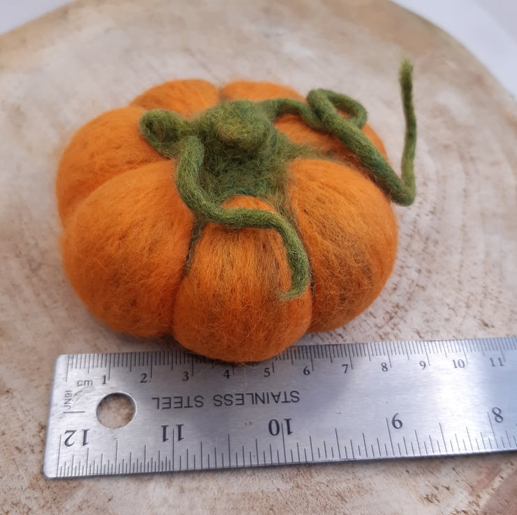 This smaller pumpkin measure approximately 8cm diameter, around 27cm in circumference and stands approximately 5cm tall. Wool through and through, including the core - no hidden plastics