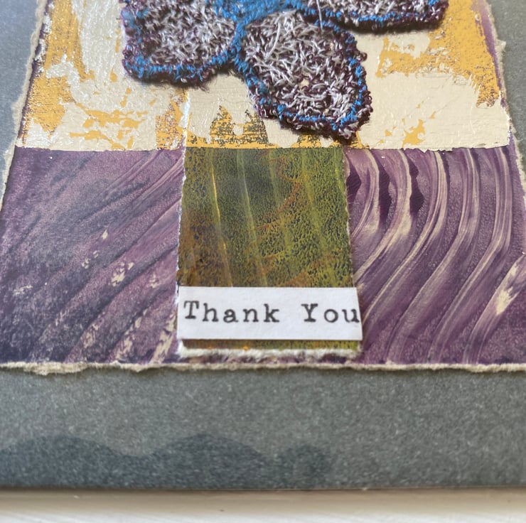 Card features my own hand printed paper with machine embroidery flower created using vintage threads from my stash! The flower sits on a metallic panel that compliments the design.