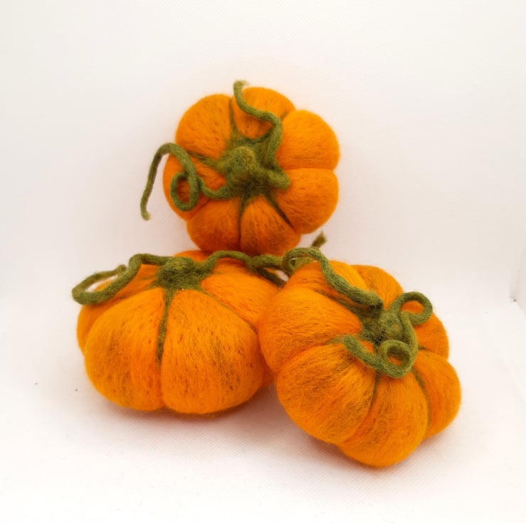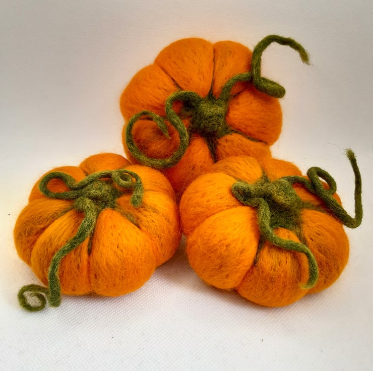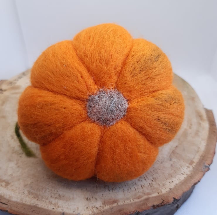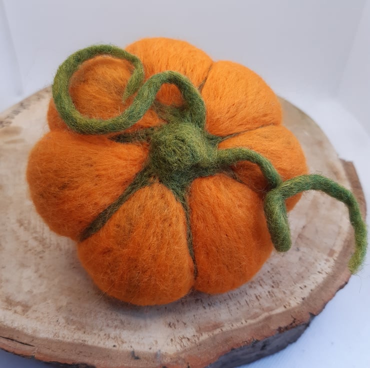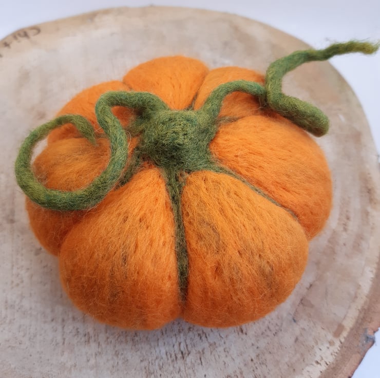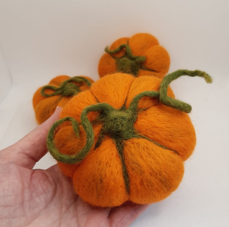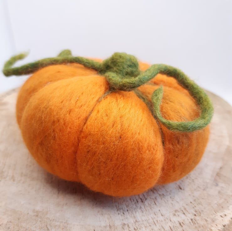 This medium pumpkin measures approximately 11cm diameter, around 32cm in circumference and stands approximately 6cm tall. Wool through and through, including the core - no hidden plastics.