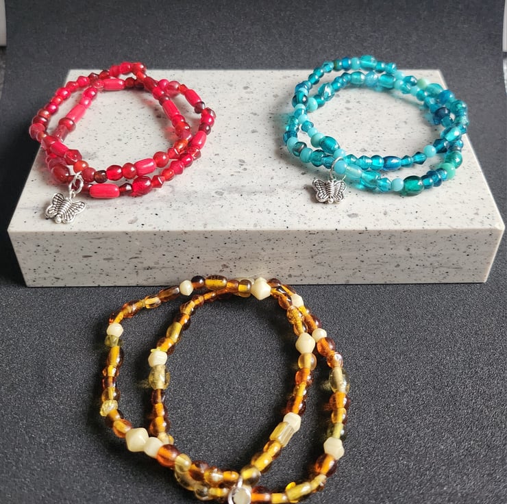 Mixed Indian Glass Bead threaded onto elastic cord to be worn as a double stacking bracelet held together with a silver butterfly charm.