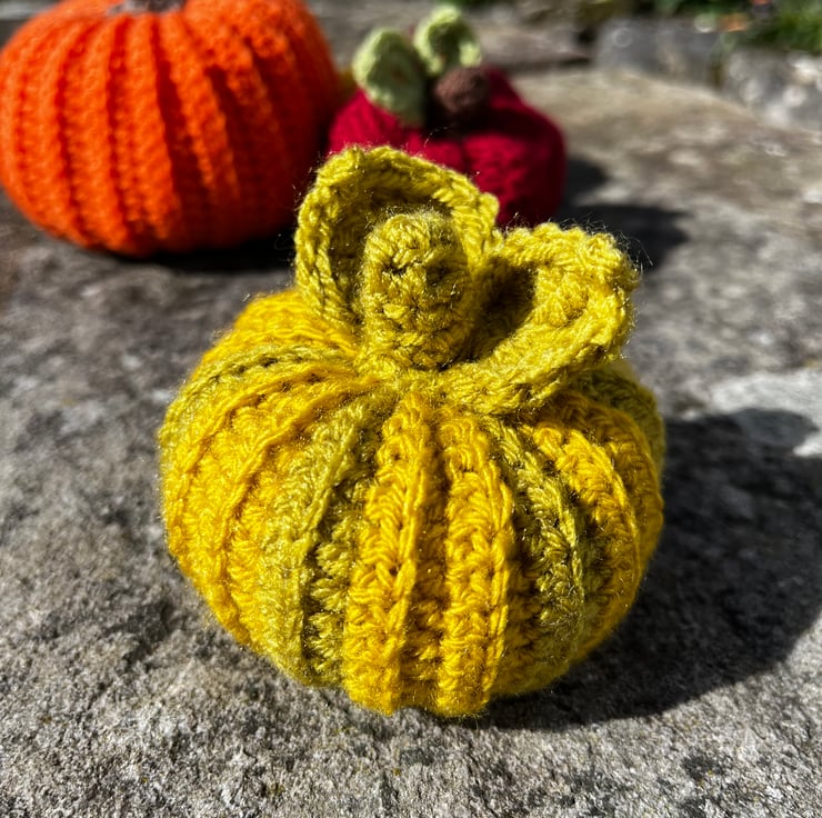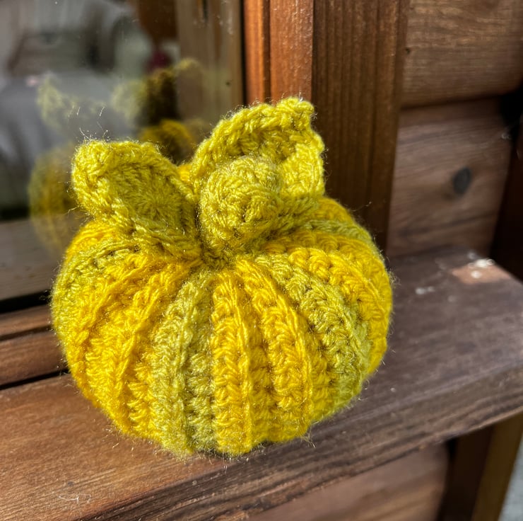Bring a warm, seasonal feel to your home with this handcrafted crochet pumpkin. Made with high-quality acrylic yarn in lime green and mustard, it features a crocheted stalk and leaf for a simple, rustic finish.