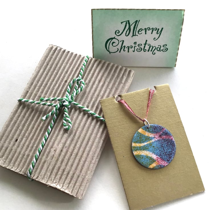 My Bauble - Enamelled Christmas Decoration measures approximately 35mm in diameter. Both sides are enamelled to give the bauble strength and durability. The decorative side in Turquoise, Yellow-Orange, Deep Pink & White in a ribbon effect design and the reverse in a mixed colour. The Bauble - Christmas Decoration hangs from a wired ribbon and is the latest of my Christmas decoration designs. It will be sent in festive packaging by Royal Mail ‘Tracked’ delivery.