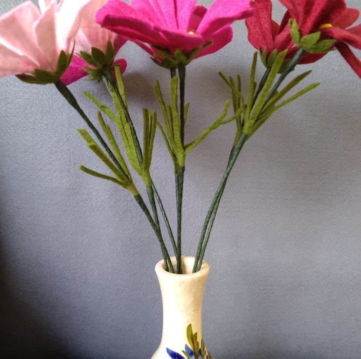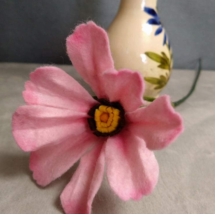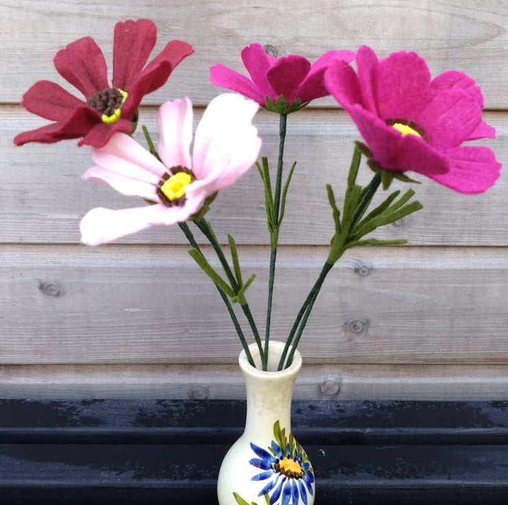 One felt cosmos flower, available in bright pink, pale pink or chocolate colours. Each flower is cut by hand, coloured, shaped and assembled on wire from wool blend felt. Each stem is 30cm tall and can be bent to suit your chosen vase. Price is for one cosmos flower, vase not included. and is sent with FREE UK POSTAGE. Please message me with which colour you would like.