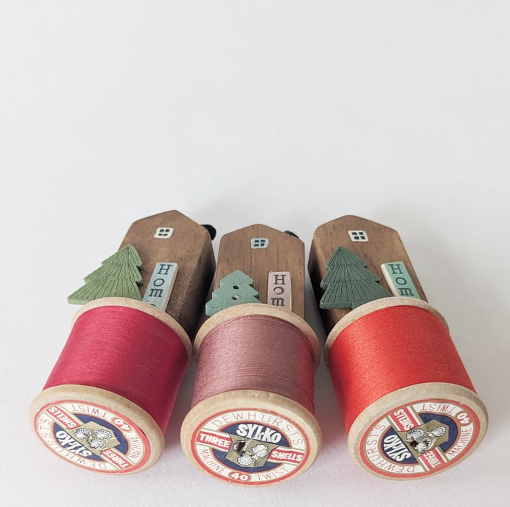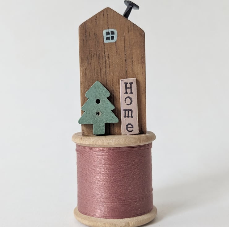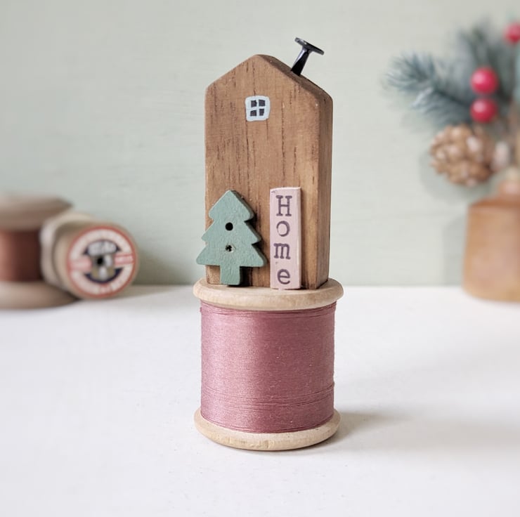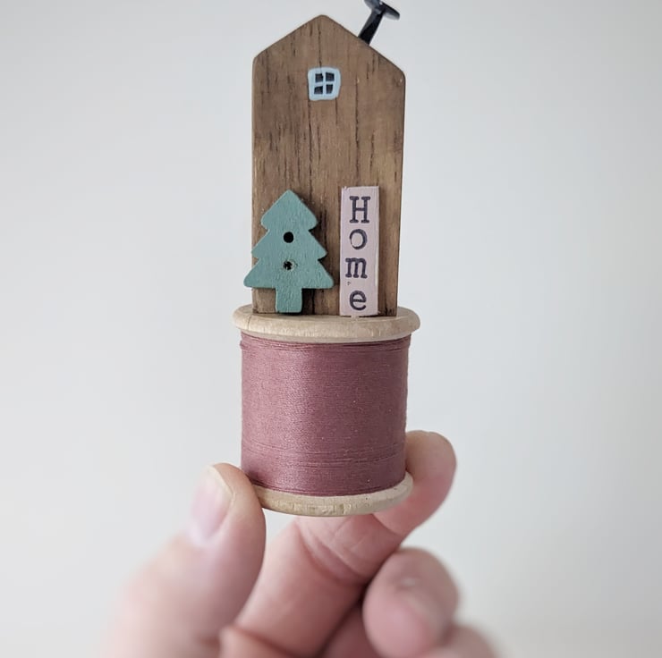 A hand painted little dark wood house sits happily on a colourful vintage bobbin.