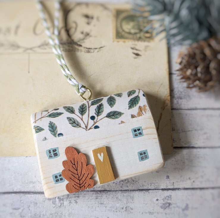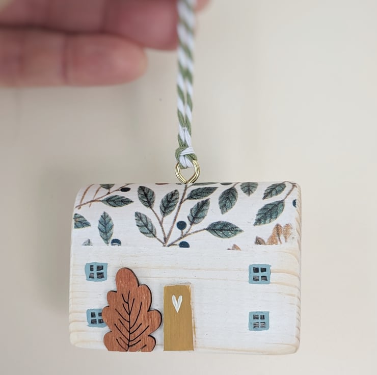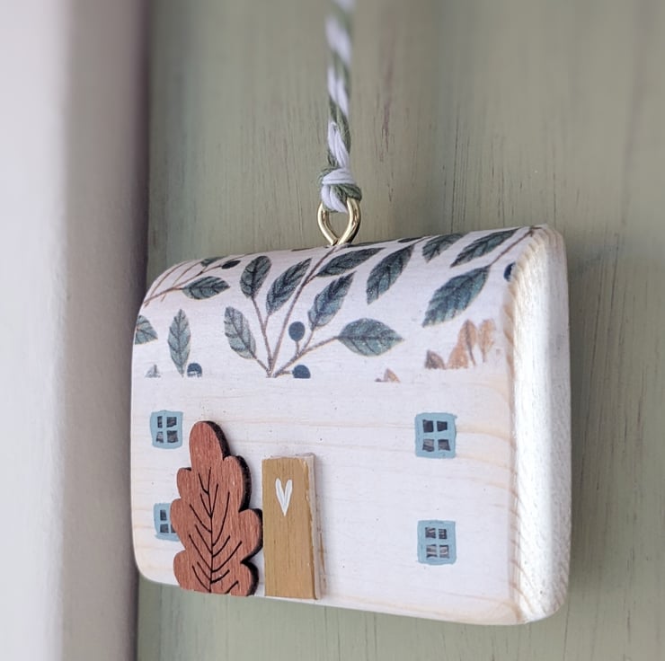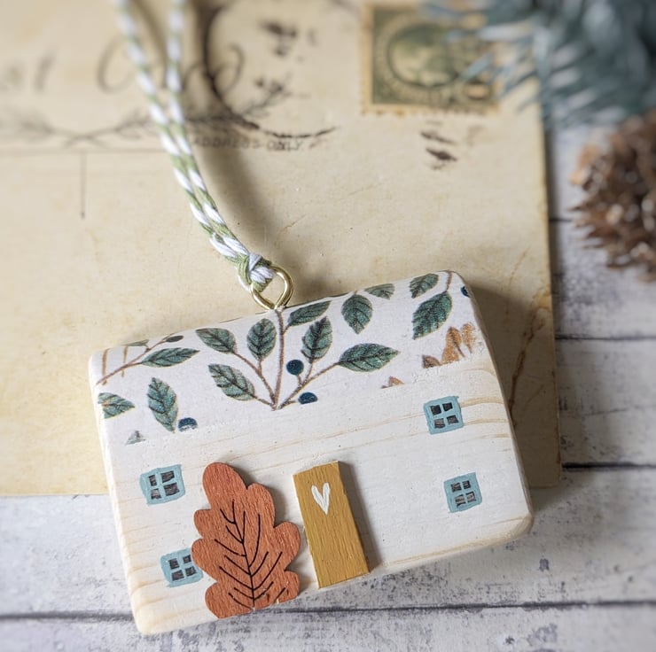 Hand painted with teeny windows and a wooden front door these one of a kind houses are ready to hang.