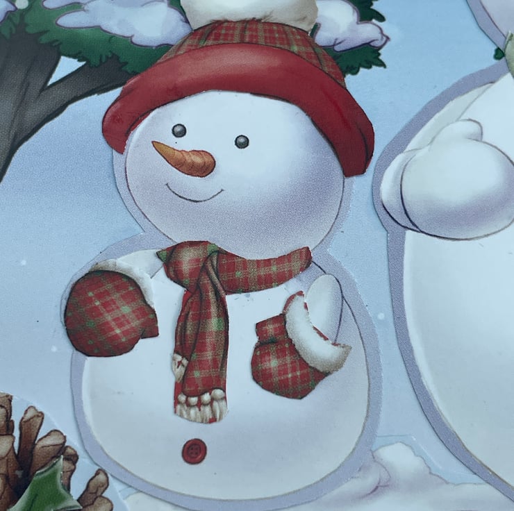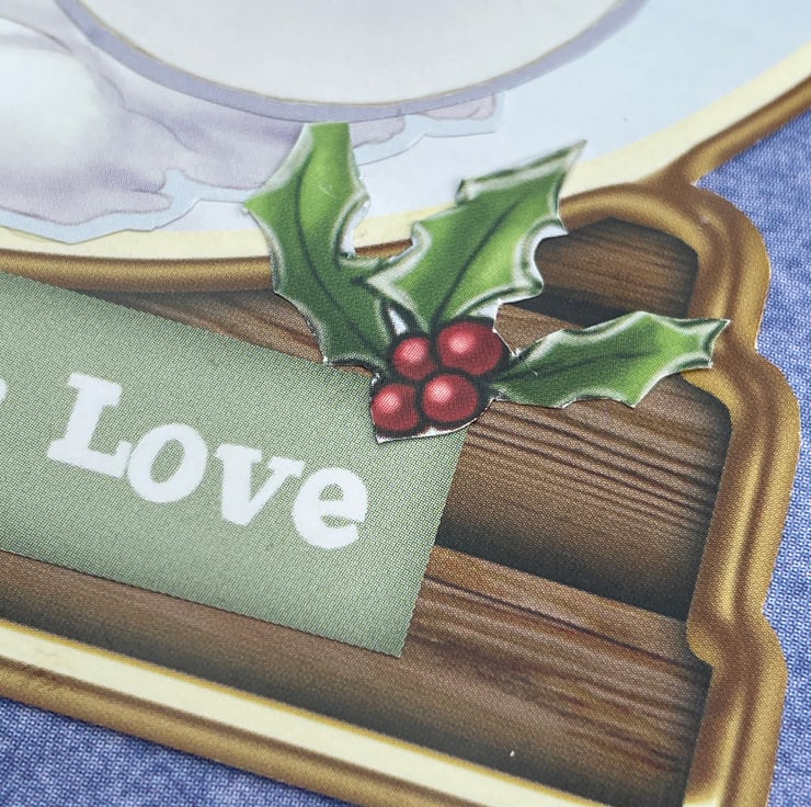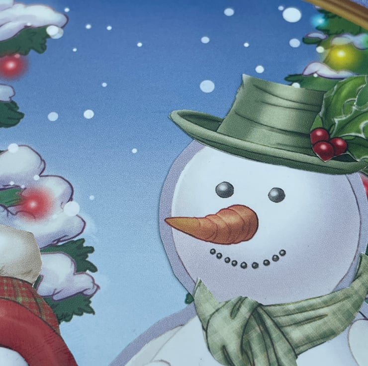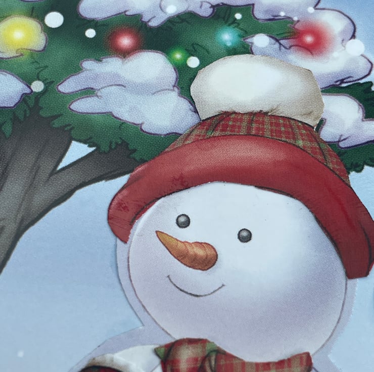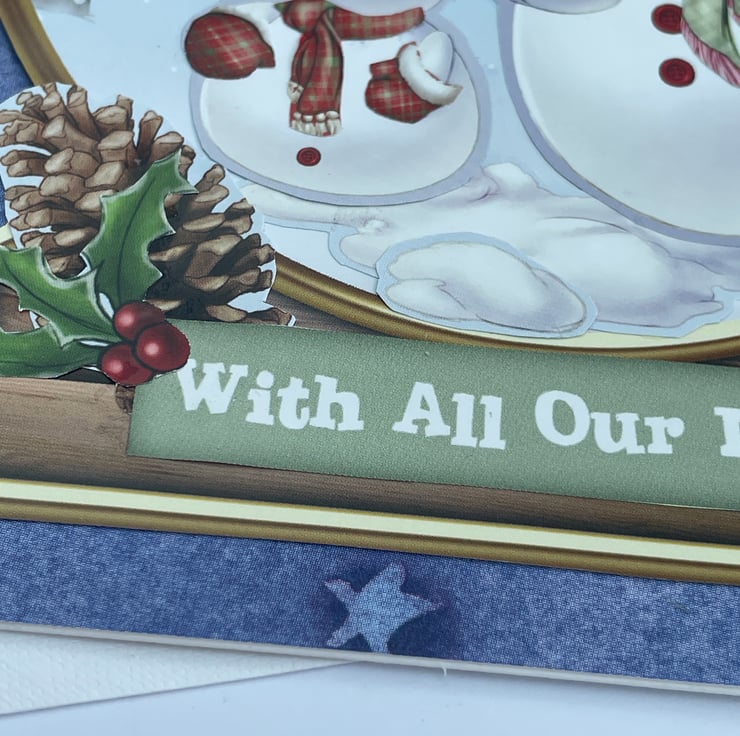 A cute snowman card for a merry Christmas greeting. This 13x13cm card features a starry background. On this is a snow globe with trees and Christmas lights. There are 2 snowmen standing in front of the trees. One has a bobble hat and mittens, the other has a hat and scarf. There is a With all our love greeting that is decorated with holly and pine cones. The inside of the card is blank for your greeting.