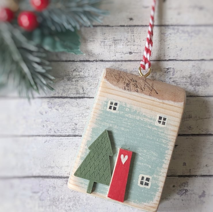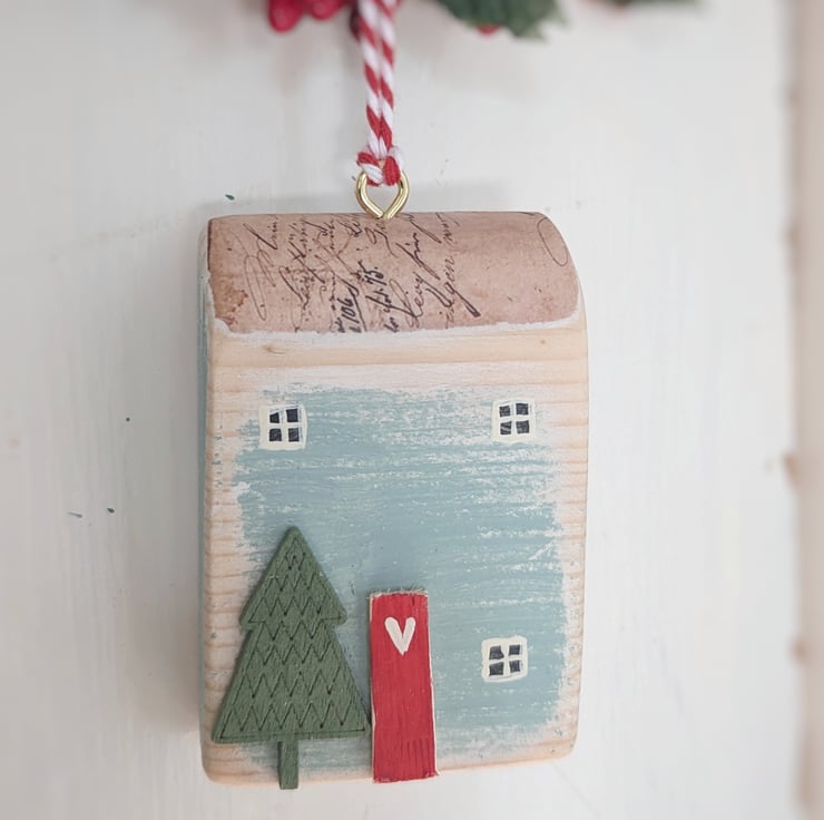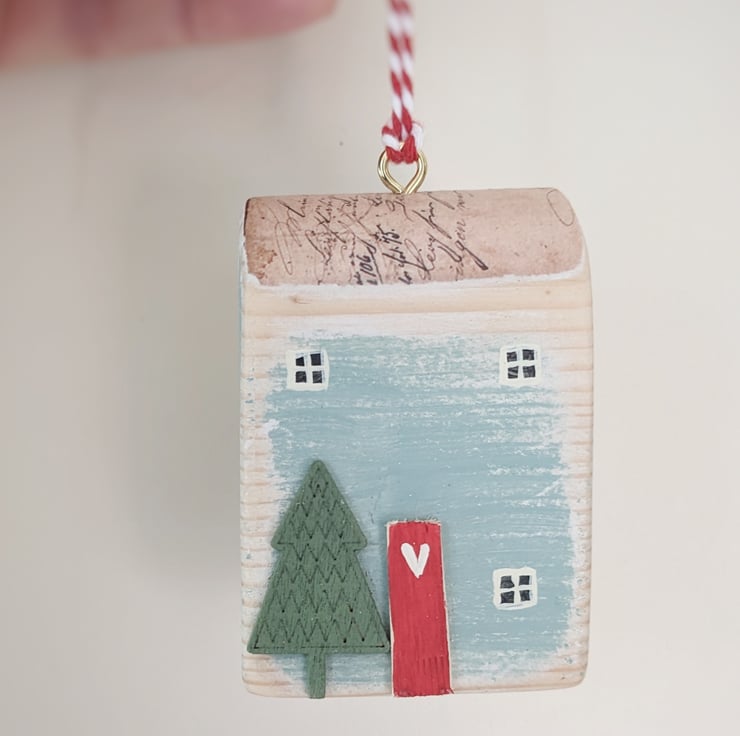 Hand painted with teeny windows and a wooden front door these one of a kind houses are ready to hang.