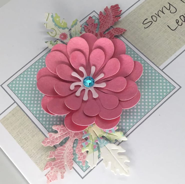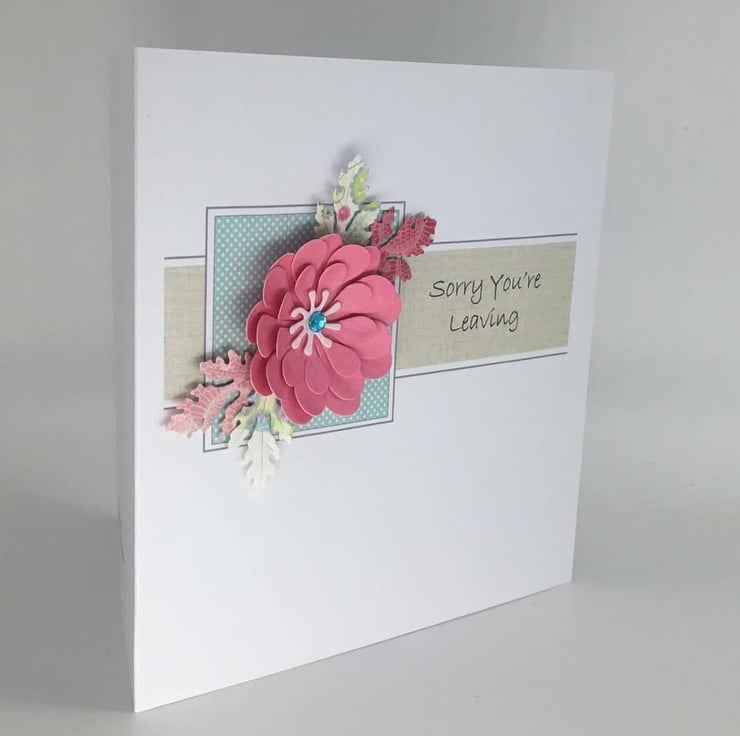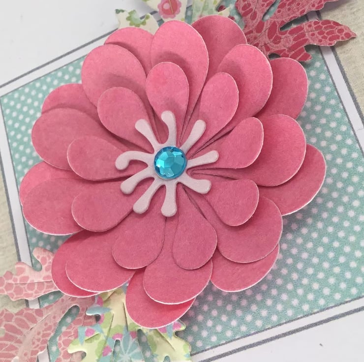 A handmade card featuring a hand die cut flower with foliage, cut from quality pink card and patterned papers on a pale teal polka dot background. The flower is embellished with a turquoise adhesive gem centre and has been given extra dimension by slightly curling each layer before assembly.