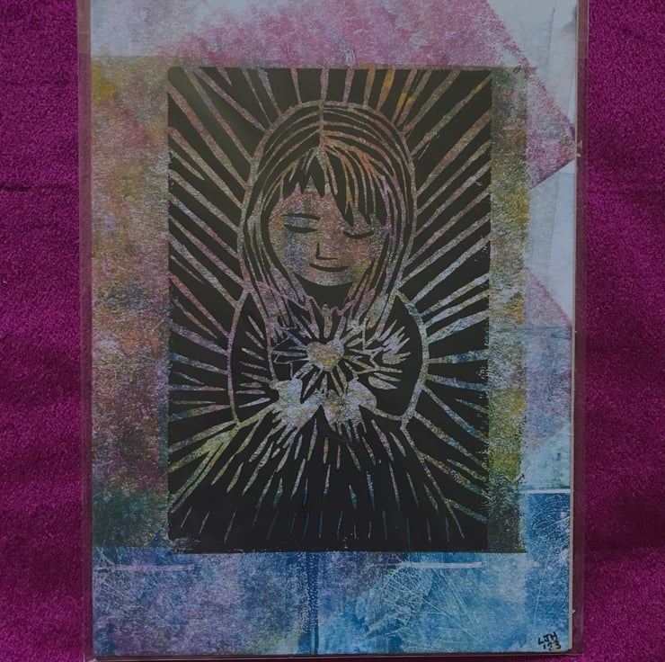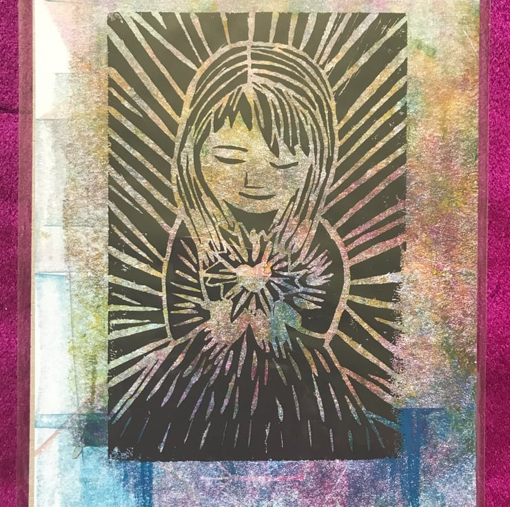 This is one of those pictures that seems to have popped into my head from time to time, and this time around I decided to turn it into a lino print, which I feels captures the dynamic moment when her heart lights up and sends out rays of light, all around the little girl. I recently started to train in reiki, and this image really resonates with that. Our inner light.