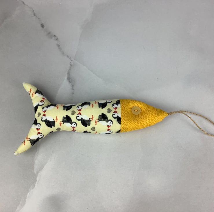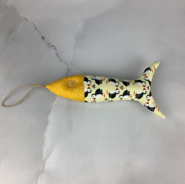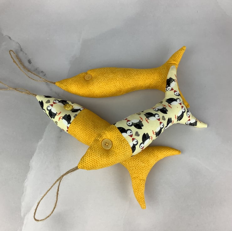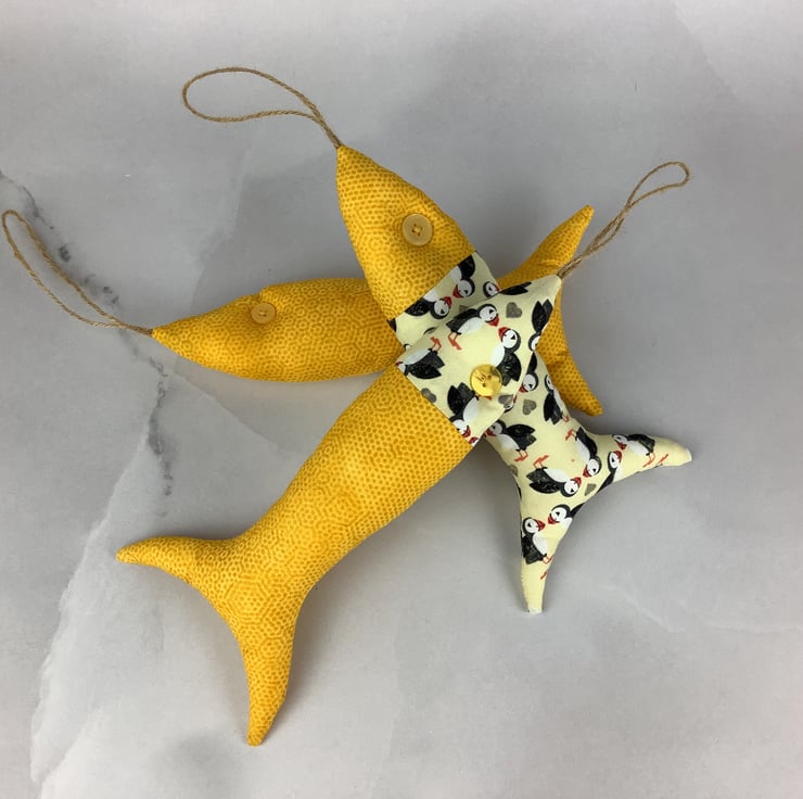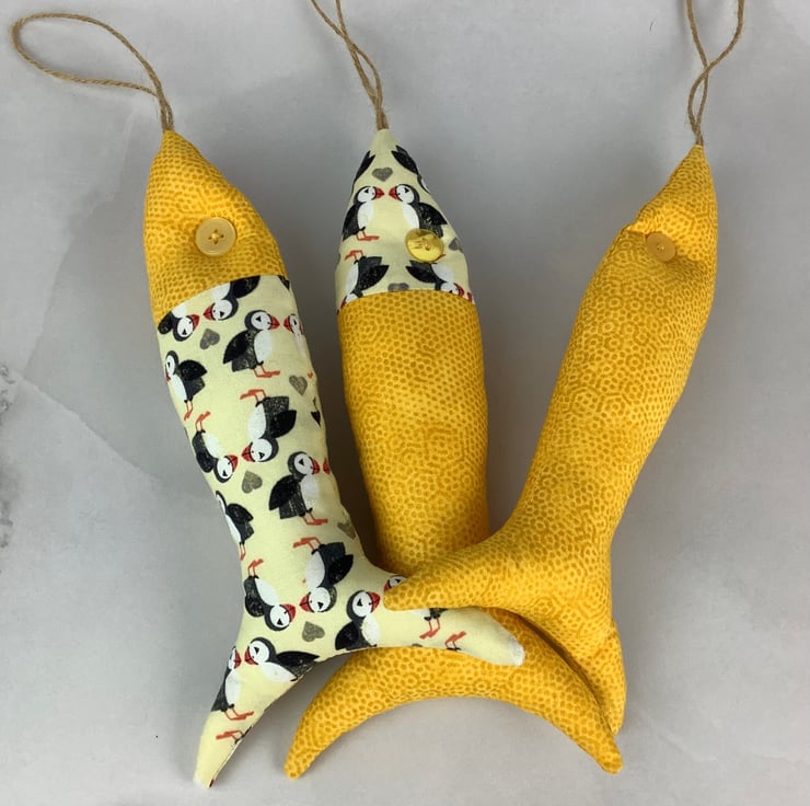 A set of 3 hanging fabric fish in fun yellow cotton fabrics.