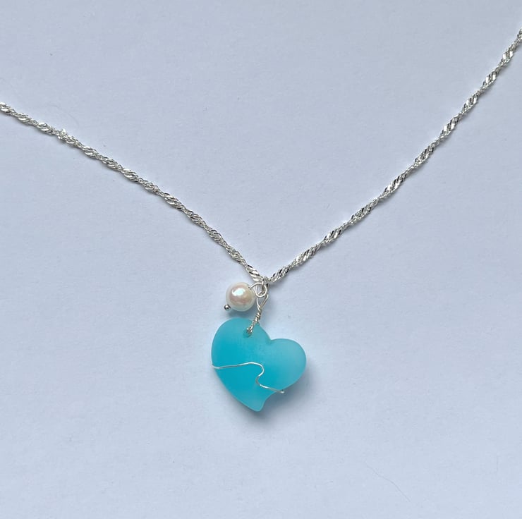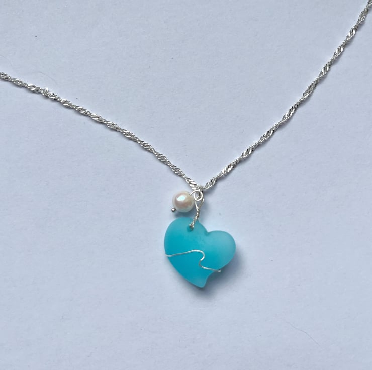 Cultured sea glass heart pendent wrapped in 925 Silver in the shape of a wave. Made with 925 silver. Also features a small freshwater pearl.